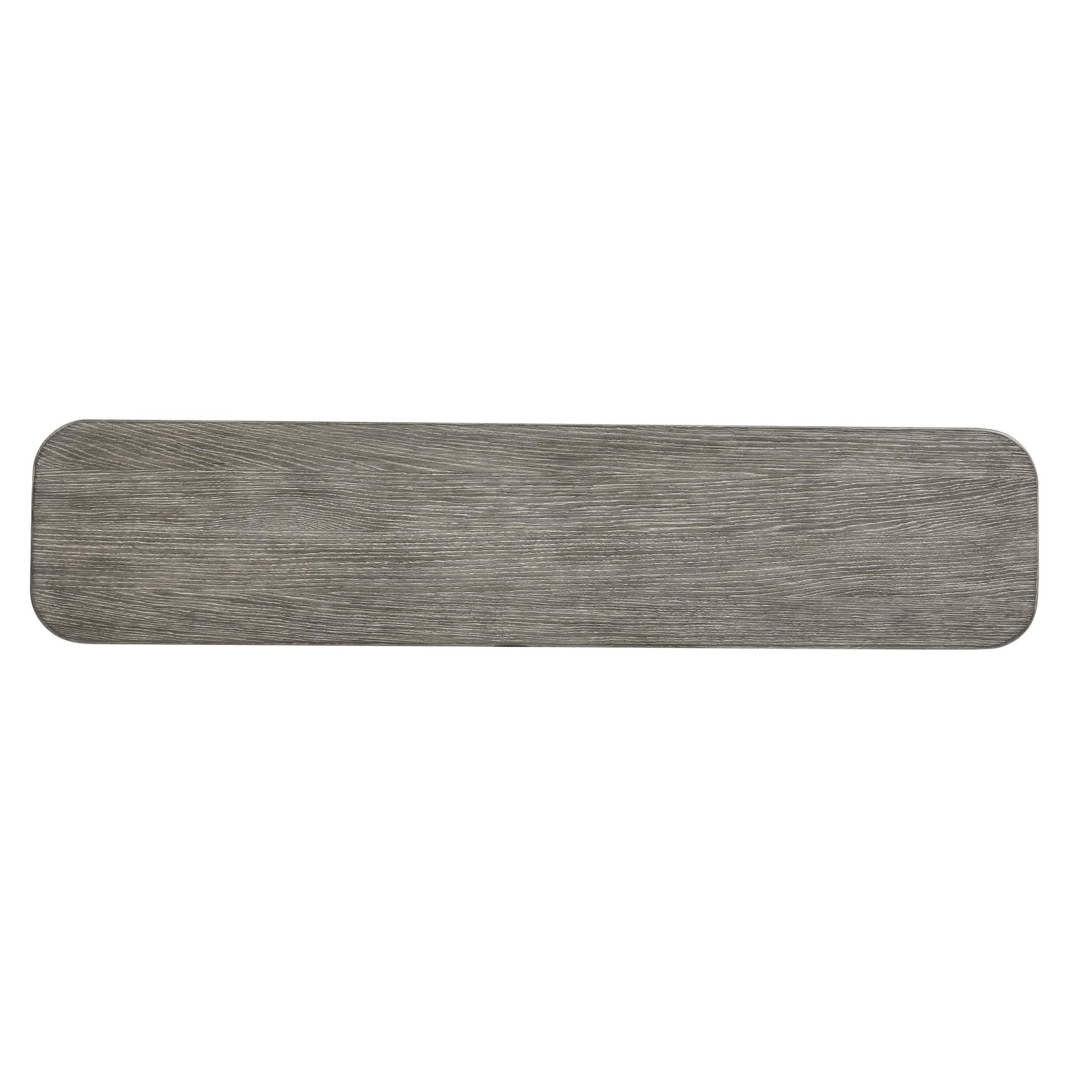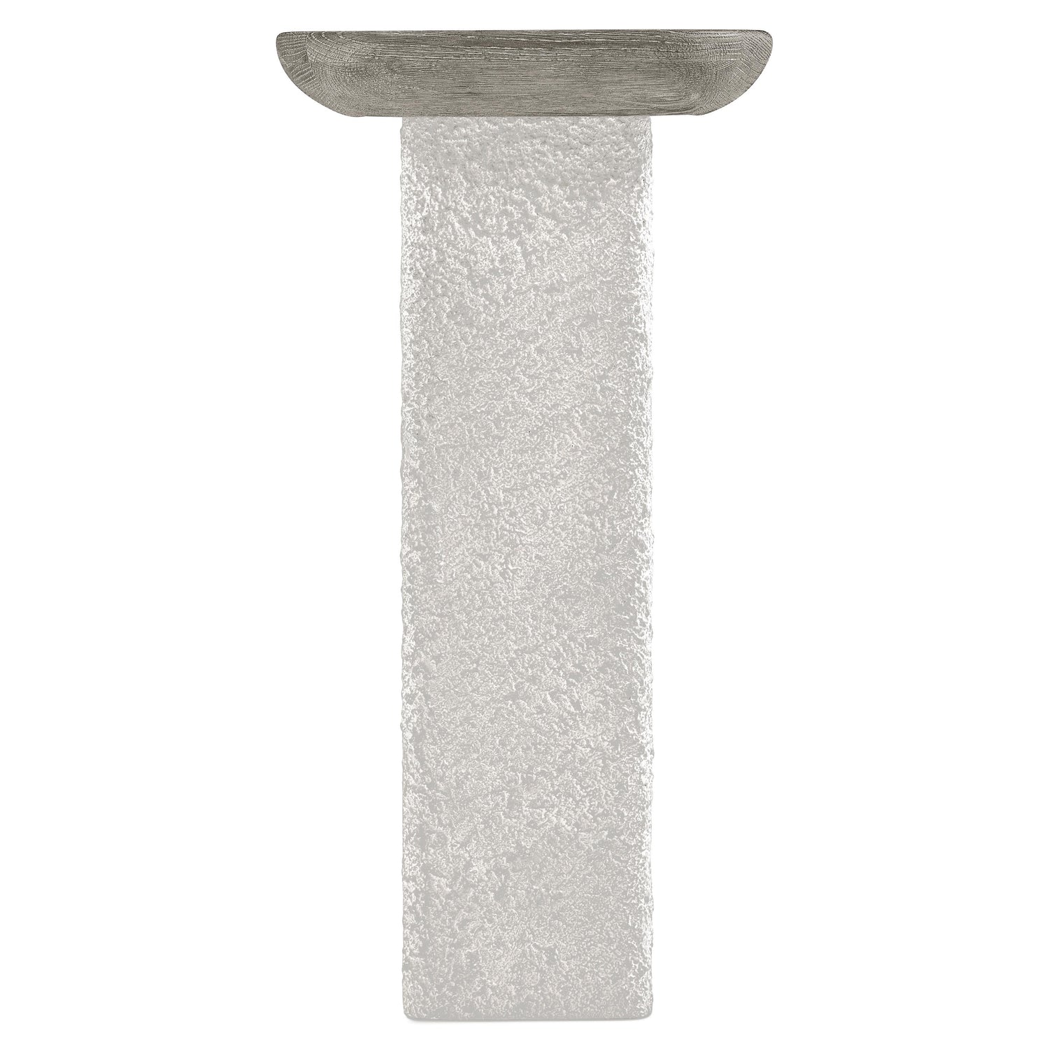 - Wirebrushed oak top in Puma finish supported by textured faux stone base pedestals in Millstone finish
