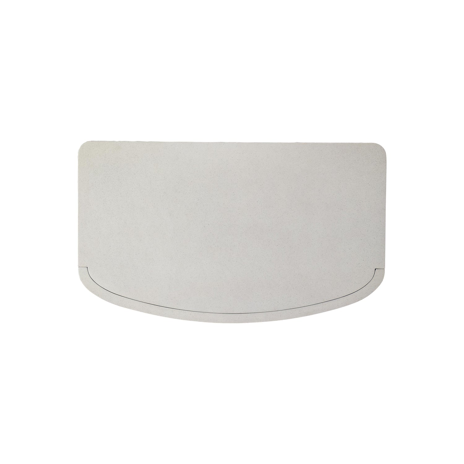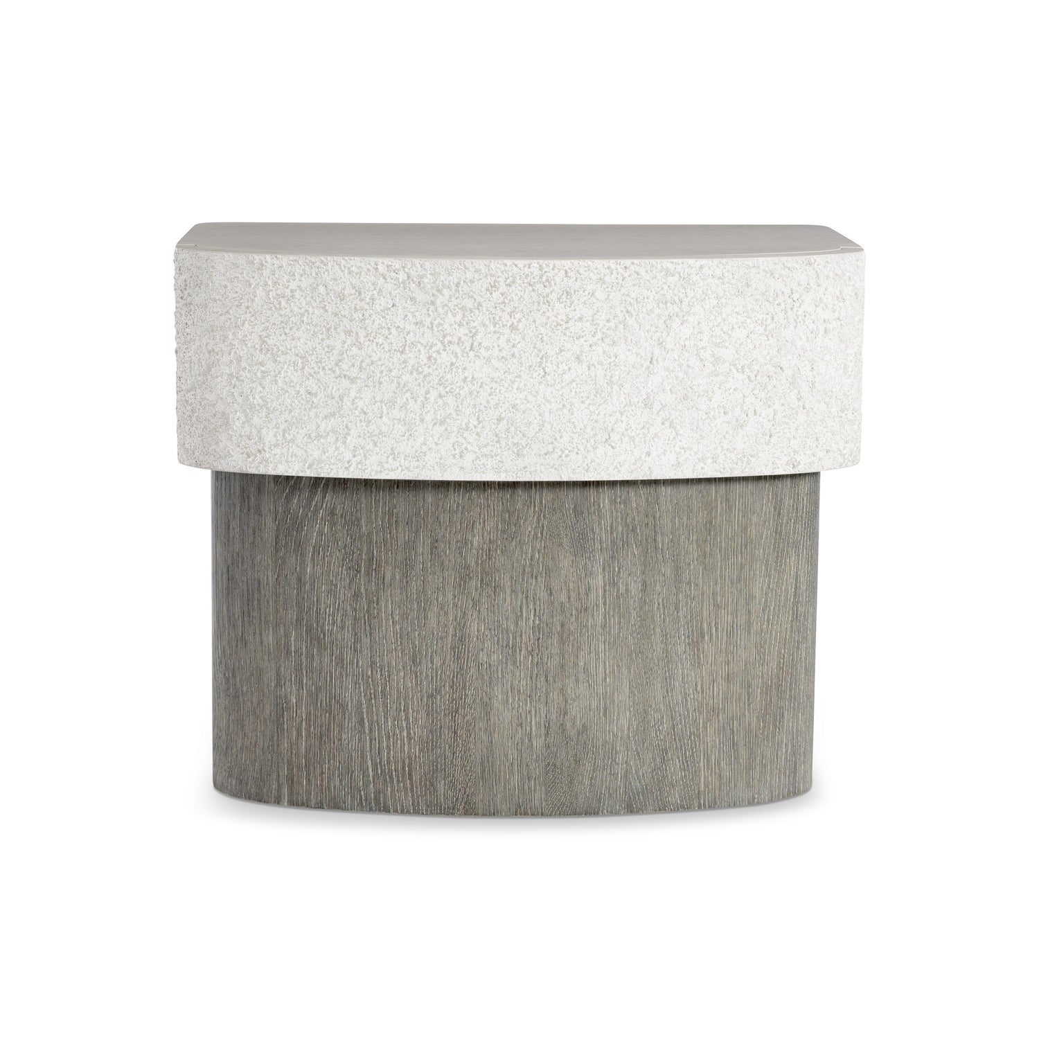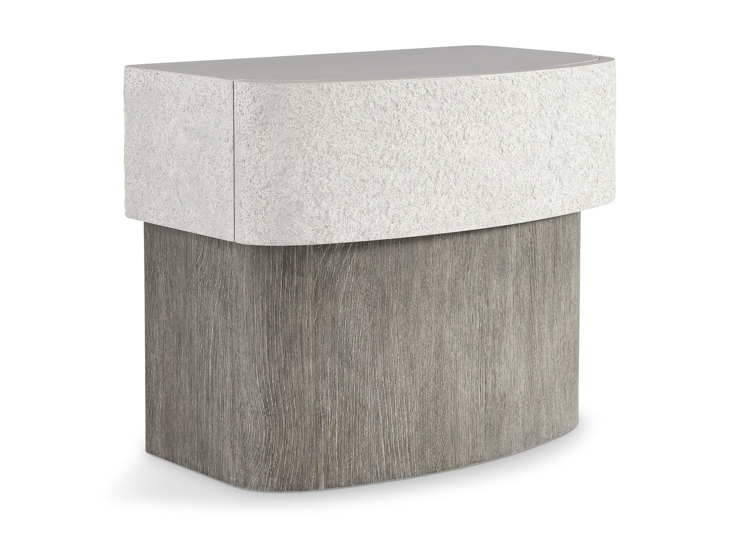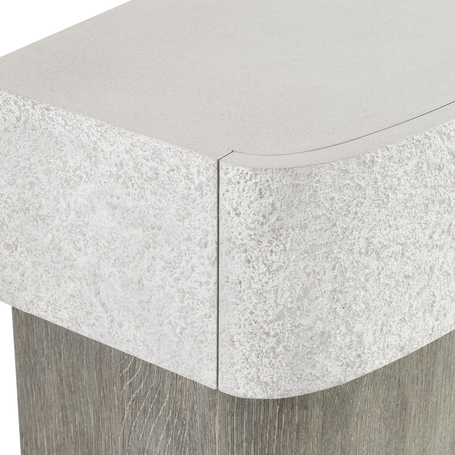 - Wirebrushed oak base in Puma finish, supporting drawer box with smooth top and textured faux stone sides in Millstone finish