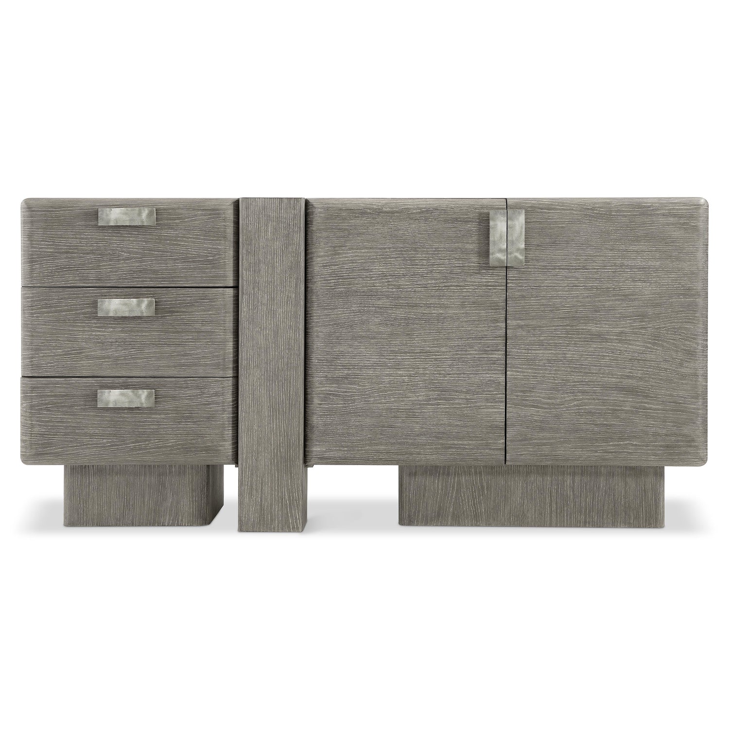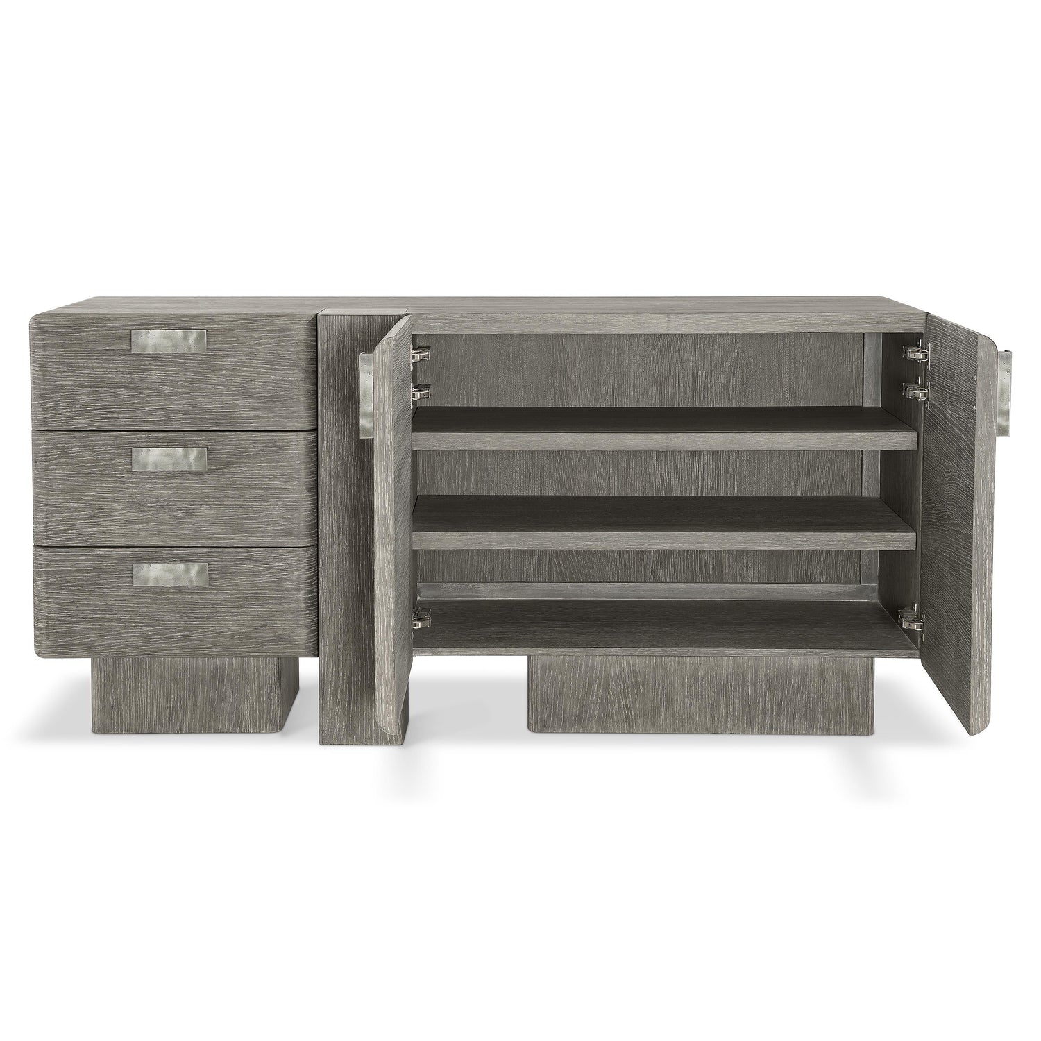 - Paired pull-to-open doors with cast aluminum tab pulls in Graphite finish, concealing two adjustable shelves