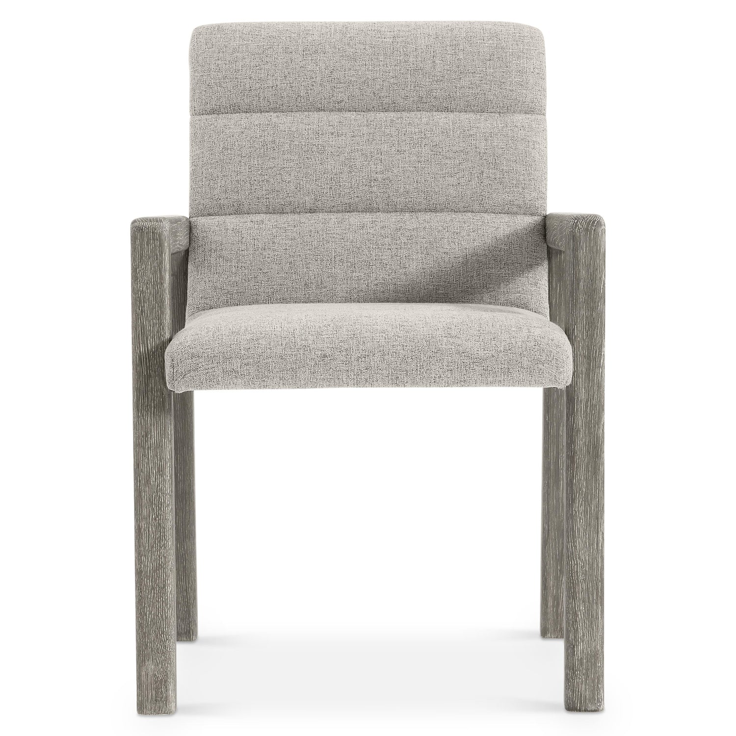 - Upholstered horizontal channels on inside back and seat, with wirebrushed oak arms and legs in Puma finish