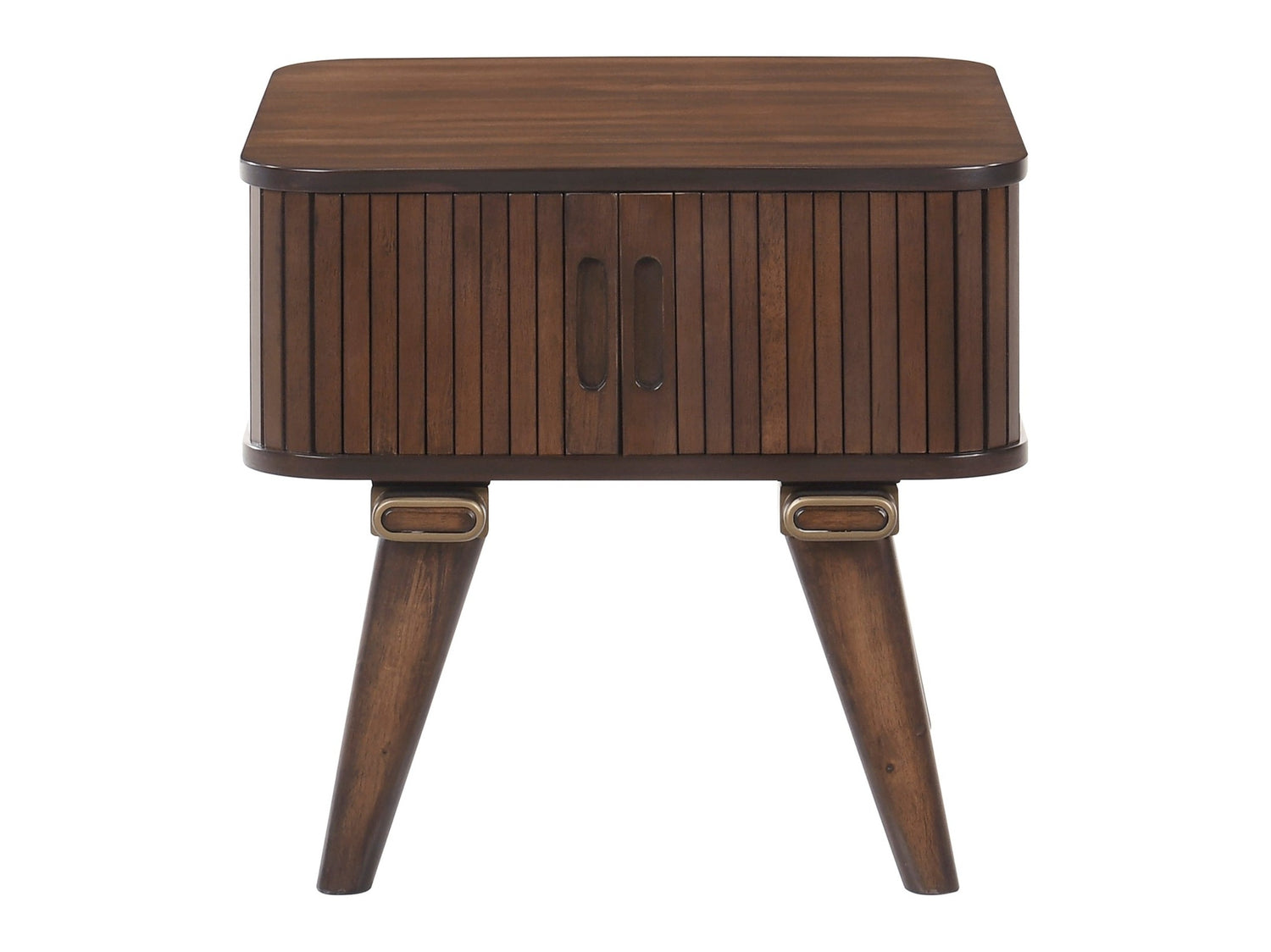 With a design that spans transitional, Mid-Century, and modern aesthetics, the Monroe Collection is in a class all by itself. Walnut veneer is accentuated with walnut finish for a classic hue to complement your casual living room. The modified a-frame base serves to support the square top of the end table, with detailed accenting lending subtle modern touch. Tamboured doors encircle the end table, the wrap-around design opening to reveal a compartment, allowing for convenient storage within quick reach.