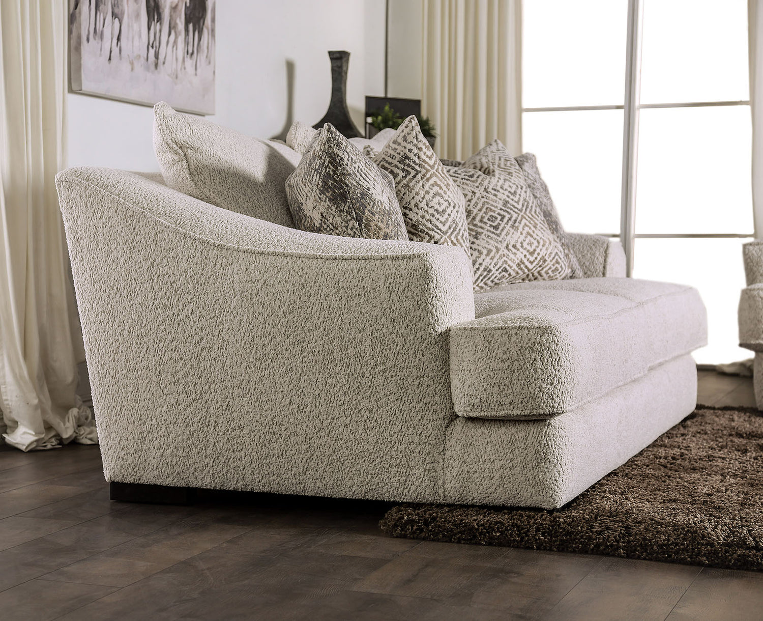 Bright grays and whites work in harmony to produce this stunning set. Welt trim outlining the collection arms and cushions and a unique textured fabric give each piece a timeless feel. Cushions are reversible offering impeccable comfort with spring seats and webbed back suspensions. Included pillows with ashy graphics are filled with luxurious down fiber bland. The off-white color adds to this allure - a neutral that works so well with most home motifs.
