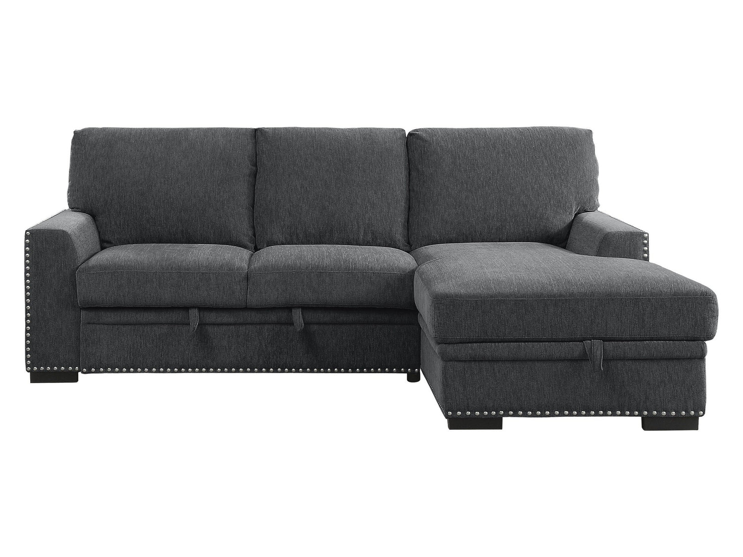 A perfect addition to your casual living room, the Morelia Collection’s functionality goes beyond that of a traditional sofa. Covered in charcoal-hued chenille, the modern profile of this seating group is defined by its nailhead trim, loose back cushions and track-style arms. Conveniently stored beneath the sofa is a pull-out trundle that rises to create a bed while the top of the attached chaise opens to reveal under-seat storage. The right side chaise and paired two-seater create a configuration perfect for your living room's available space.A coordinating swivel chair lends complementing decorative accent with its barrel shape and loose back cushion.