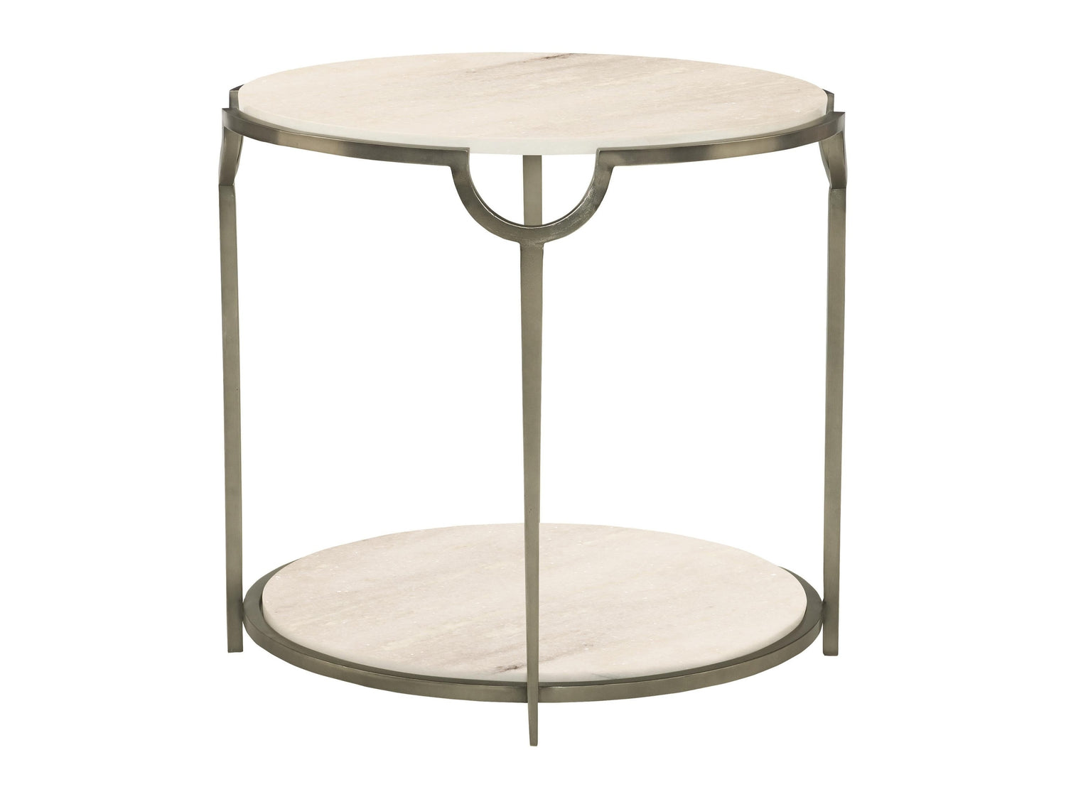Bernhardt Interiors offers high-design furniture with an eclectic edge. Elegant and sophisticated, the Morello round end table features a faux Carrara marble top and shelf supported by a solid steel frame. While the sleek geometry of the design is distinctly modern, an oxidized nickel finish lends a touch of antique appeal to this refined accent piece.