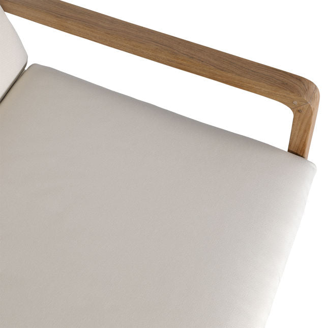 The Moretti Outdoor Occasional Chair features solution-dyed acrylic upholstery in ivory, complemented by a natural teak wood frame. Designed for outdoor use, it combines durability with elegance, offering a stylish and comfortable seating option for patios and gardens.
