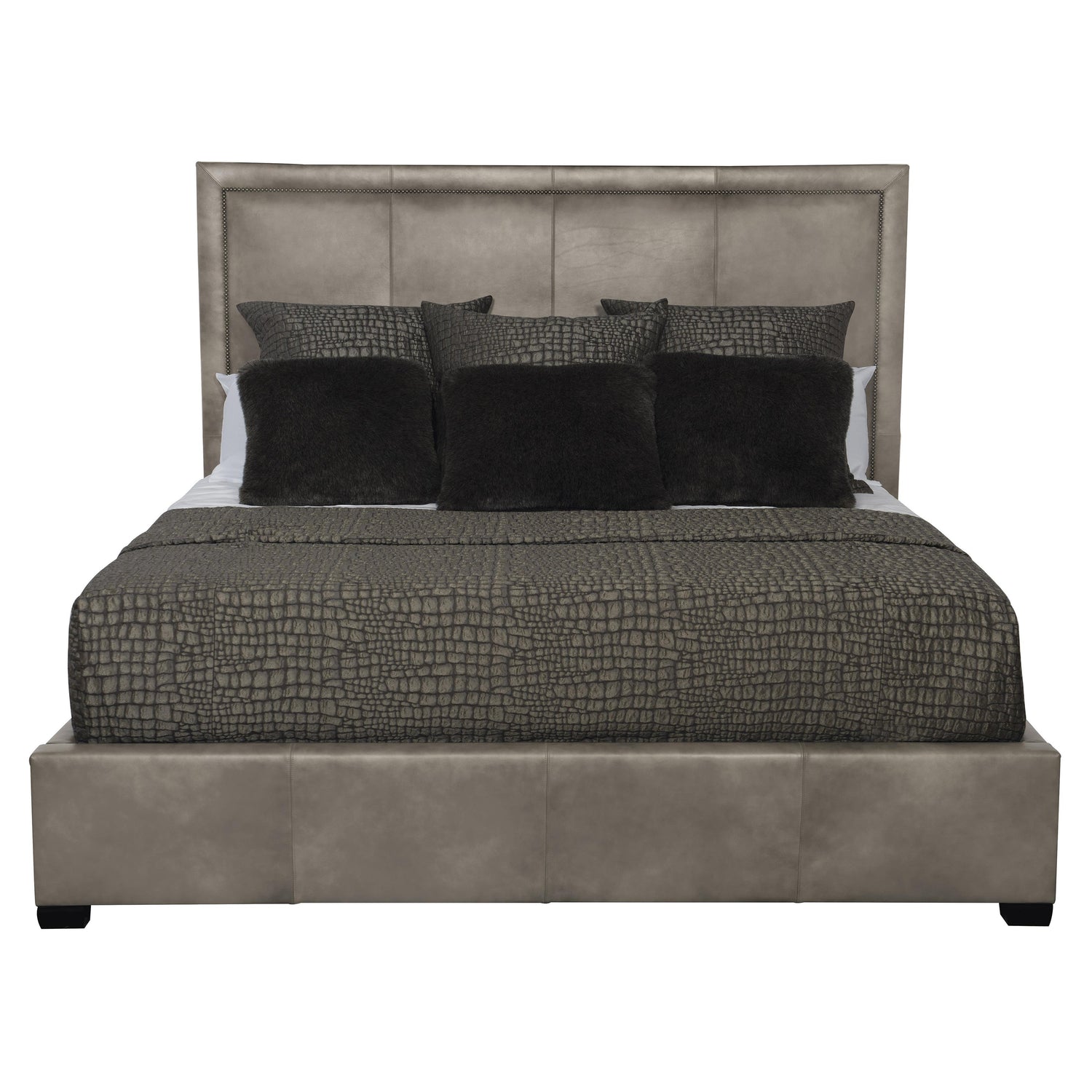 Bernhardt Interiors offers a selection of luxurious beds featuring fine craftsmanship and a distinctly modern styling. The fully upholstered Morgan panel bed brings elegant transitional style to the bedroom. On the headboard, refined nailhead trim surrounds a picture frame panel. The wooden feet are available in smoke or espresso finish.