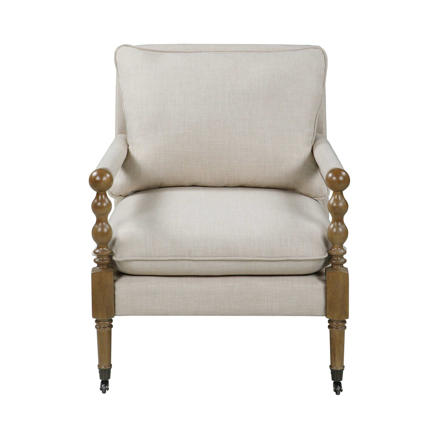 Introduce stylish comfort to a master suite or living room seating area. This upholstered accent chair features wonderful linen-line fabric that elevates its inviting style to new heights. Exposed wood framing in a dark oak finish draws the eye and offers a touch of contrast. The chair features a plush seat and back pillow, with covered arms that add comfort. Curl up with a book or catch up with a friend.