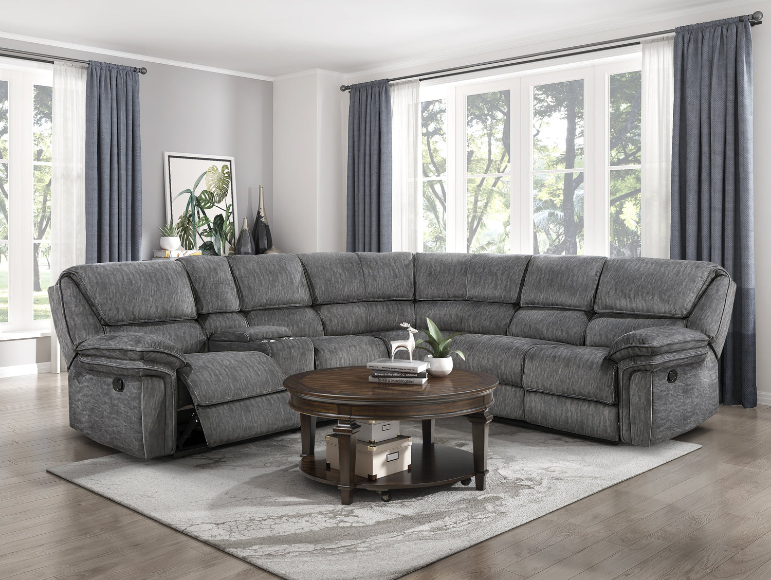 With a versatile style that is perfect for your casual living room, the Muirfield Collection’s plush seating and modern aesthetic create a platform for your relaxation. The plush pillow-top arms and seating of the sectional is covered in smoke gray fabric upholstery for neutral accent to your home’s decor. The left side seating of the sectional features a center console, its cupholders and hidden storage providing functional convenience to the group. The end chairs of the sectional feature manual-motion mechanisms that are operate with the pull of a side-mounted tab, taking you from seated to reclined in an easy motion.