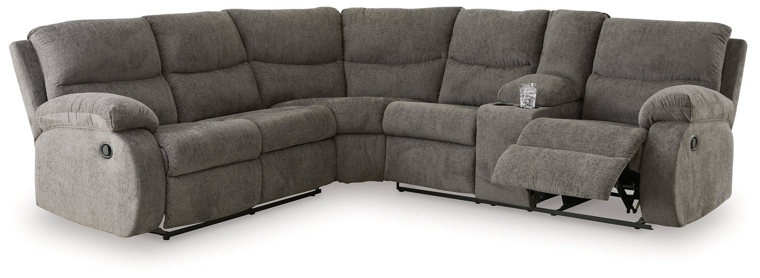 Cozy comfort is on the rise with this reclining sectional. So velvety soft, the trendy pewter-hued chenille upholstery is made for everyday indulgence. Overstuffed and stylishly wrapped, the sumptuous cushions and pillow top armrests display the comfortable side of contemporary. A padded center console with hidden storage and dual cup holders blends form and function. And with one easy pull, you're on your way to endless relaxation with plenty of room to stretch out.