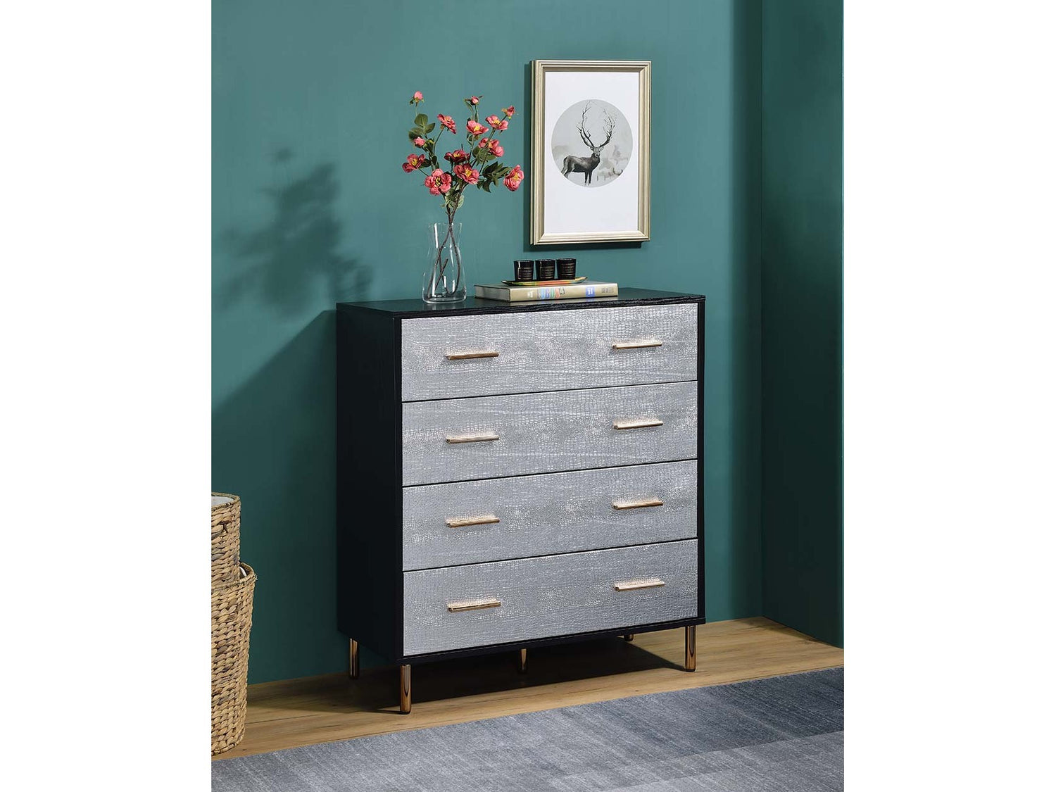 This Myles chest is a charming addition to your bedroom, with four drawers that are perfect for storing clothing and other miscellaneous items. The chest is finished in a black frame and with alluring gold hardware and legs, then accentuated by decorative drawer fronts that feature silver faux crocodile texture.