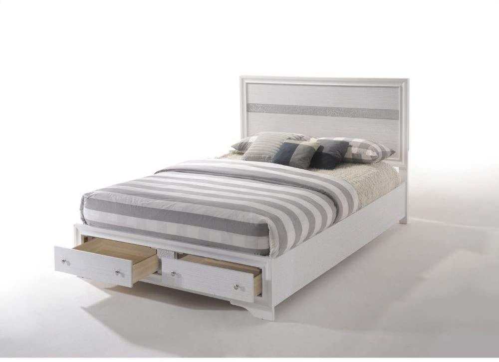 The Naima bedroom collection offers sophisticated look, clean lines and contemporary style. Features panel headboard, and storage footboard in bright white finish with contrasting light gray trim panel, which provides elegant style that will bring you a perfect sleek design for your home.