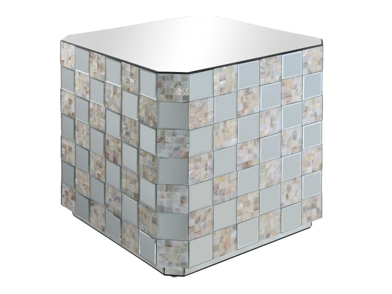 Assembled, Square End Table NO Storage Features: Mirrored Top, Base w/Mother of Peal Checkered Pattern CONSTRUCTION Mirrored Top w/Clipped Corners: Beveled Mirror, MDF Mirrored Base: Mirror & Mother of Pearl Checkered Pattern, MDF