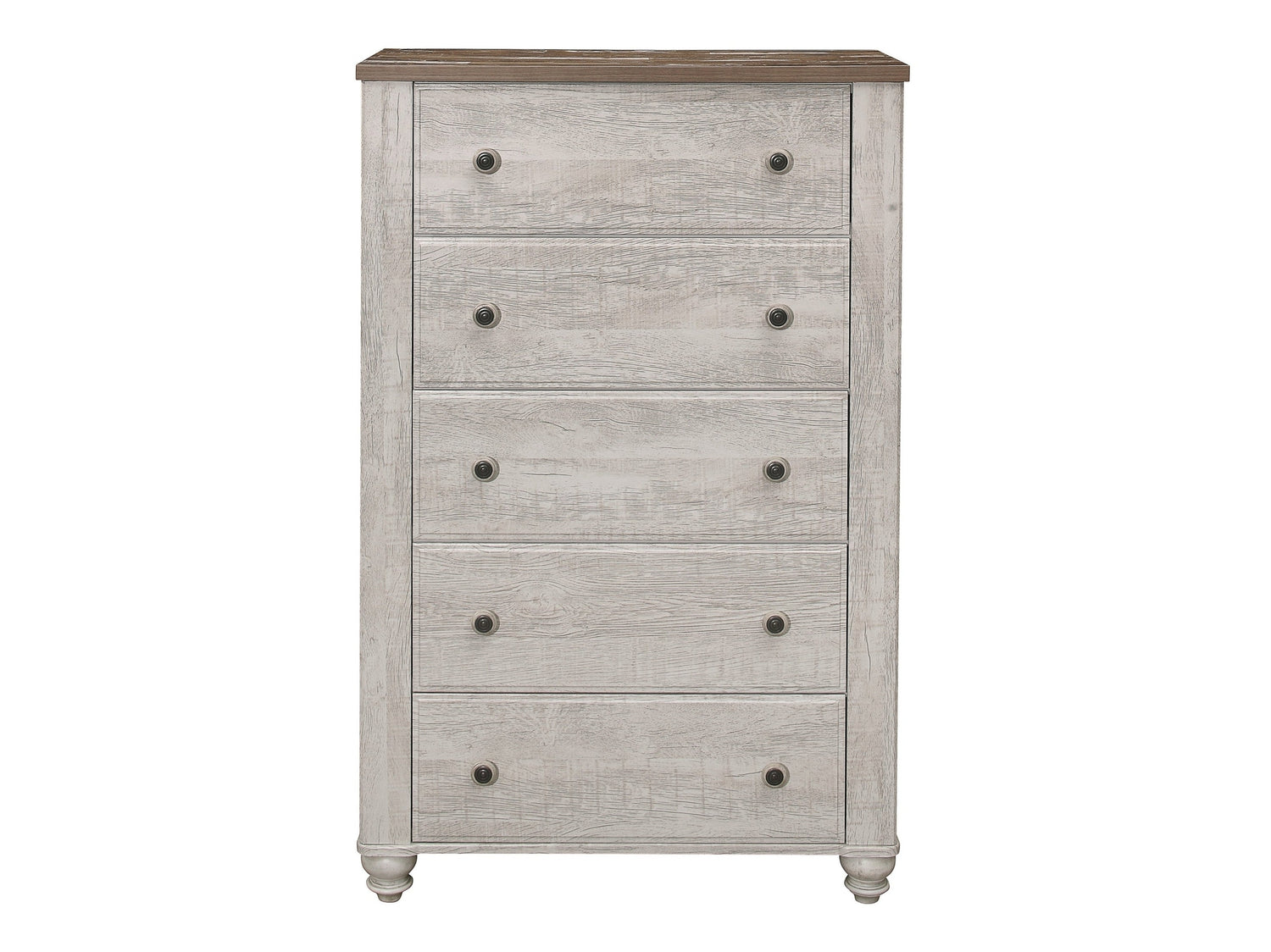 Transitional-rustic styling is expertly achieved in the design of the Nashville Collection. The two-tone faux wood look of melamine provides distinct contrast with antique white and brown lending visual texture to the chest. The classic framing of the collection is paired with knob hardware that features white wood and black metal, to complete the rustic look.