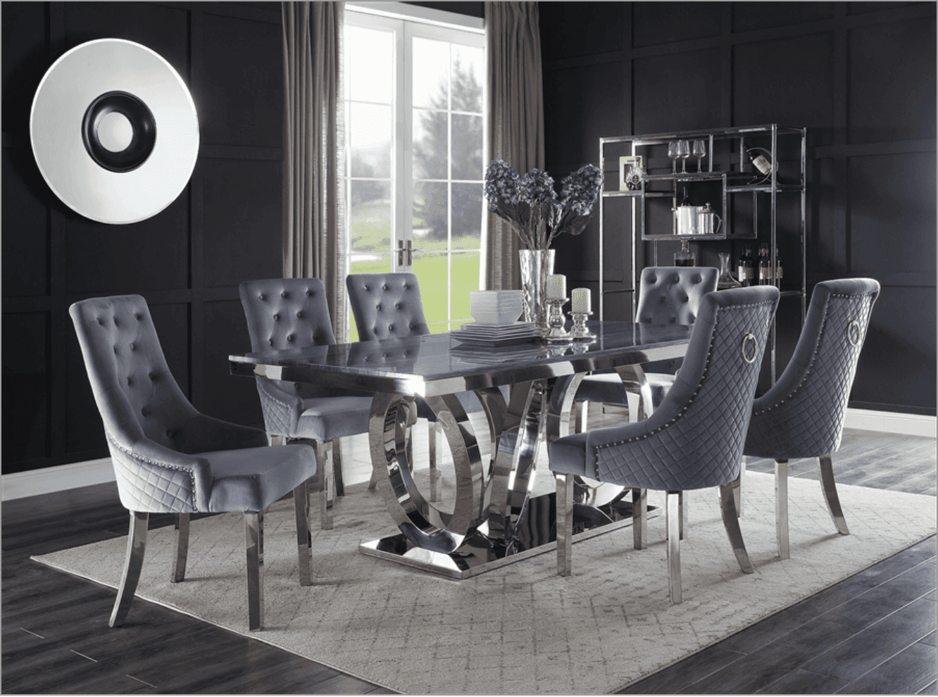 - Dining Table Finish: Gray Printed Faux Marble & Mirrored Silver Finish