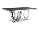 Nasir Dining Table - Gather all the stunning details you need to throw a perfect dinner party. The Nasir Dining Table features a distinctive and striking silhouette that makes any ordinary dining room appear much more unique. Gray cultured marble top cleverly incorporates classic elegance into your modern interior. Supporting the table top, the shiny stainless steel base designed with interlaced circles achieves a balance between strength and grace. Host a dinner party in style with this modernist dining table.