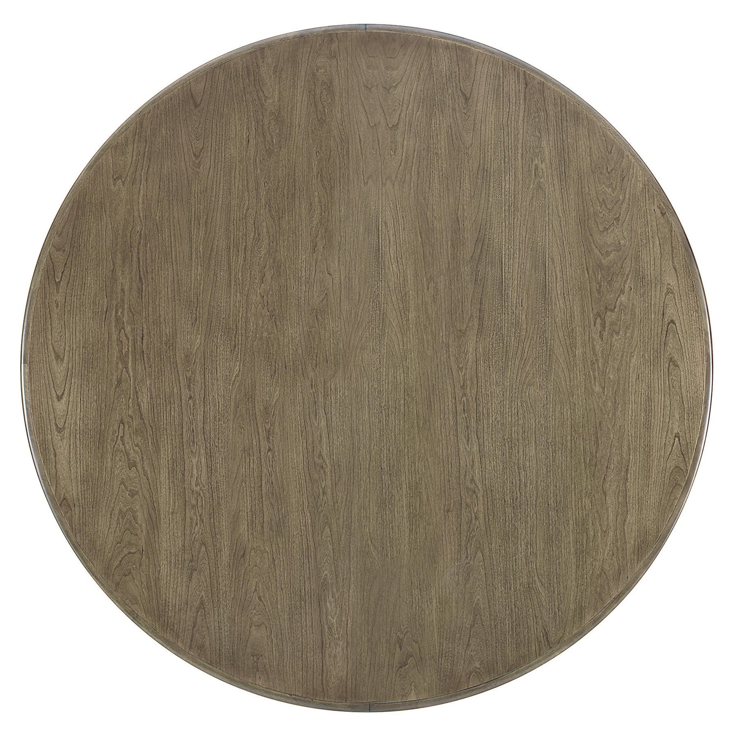 - Rustic quartered white oak round dining table top in Rustic Grey finish