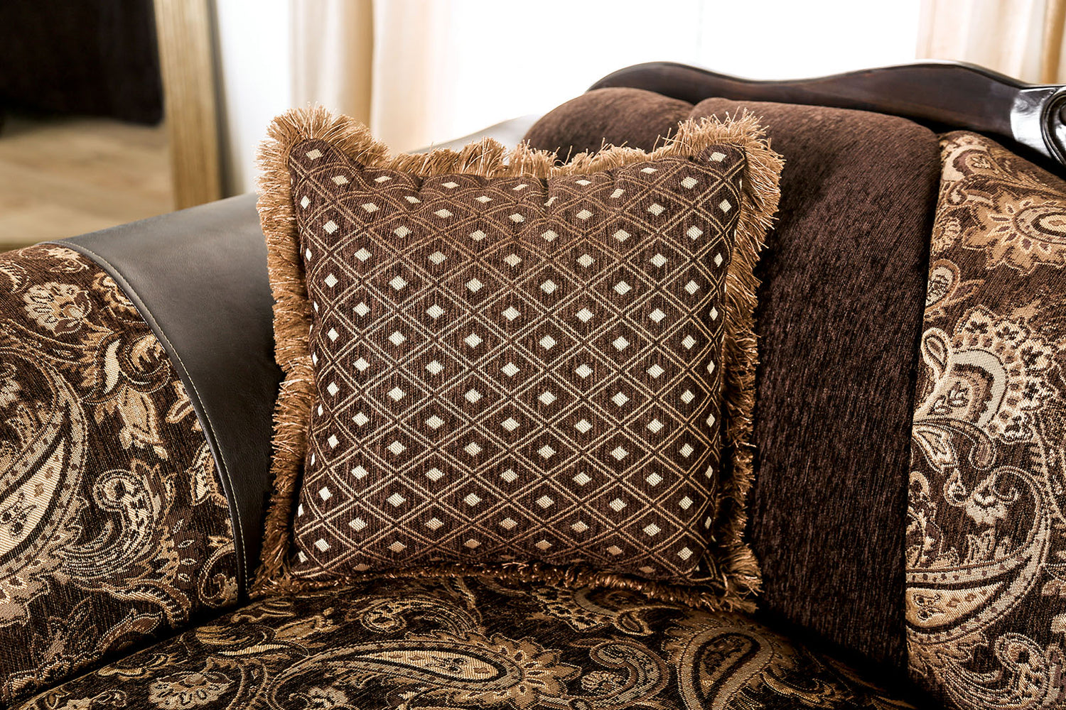A stunning traditional design pairs with some modern flair to make for a beautiful sofa collection that can handle being the centerpiece of your living room. Wooden trim details, round bun feet and carved motifs make for an elevated elegance that adds to the luxury of your room. The seat features a distinct back with split deep tufts and beautifully-patterned fabric.