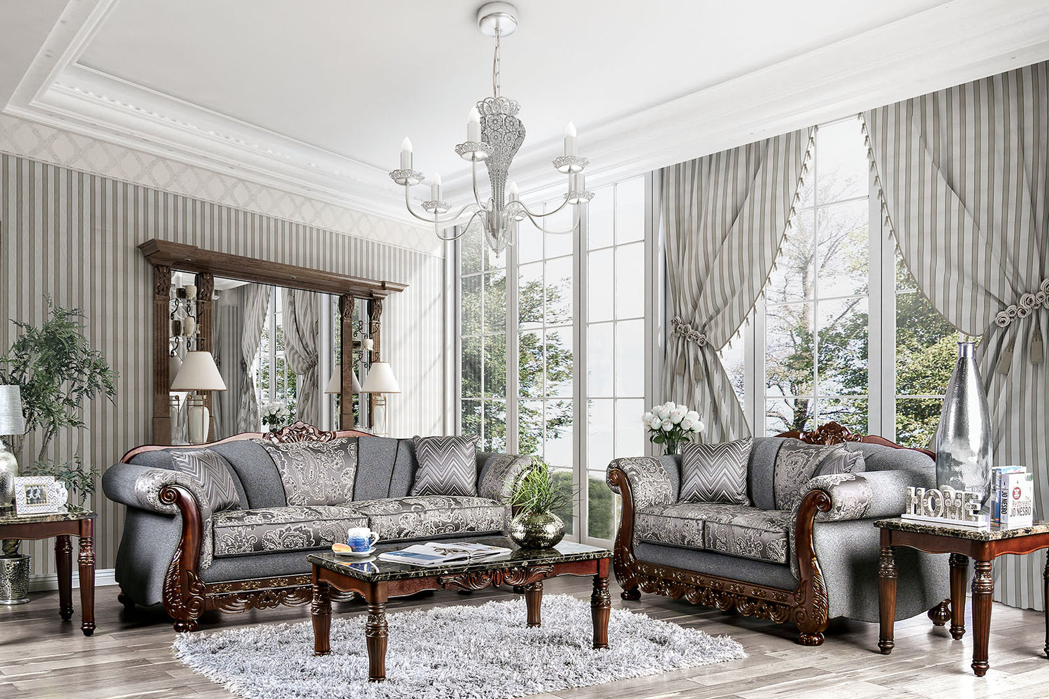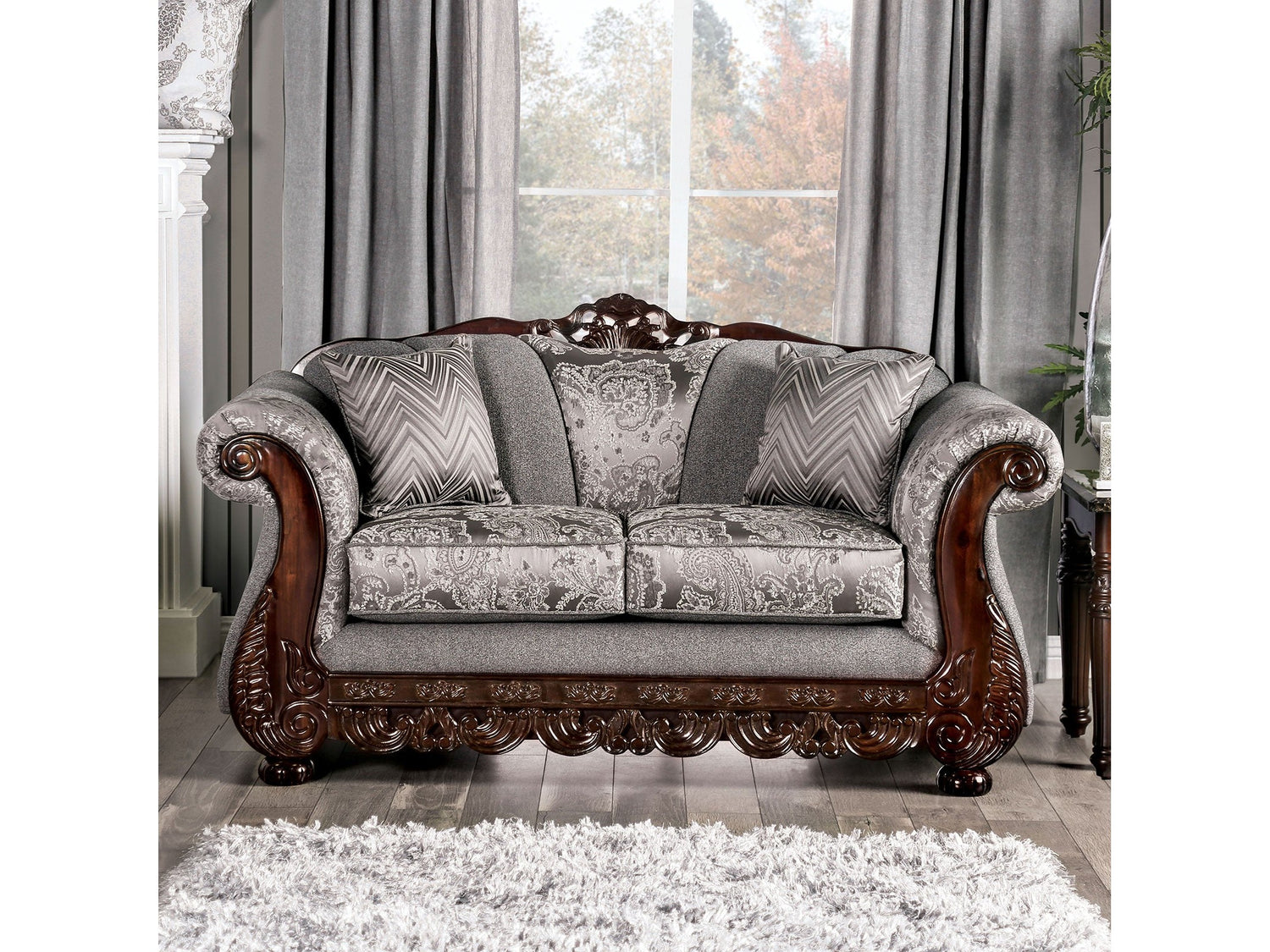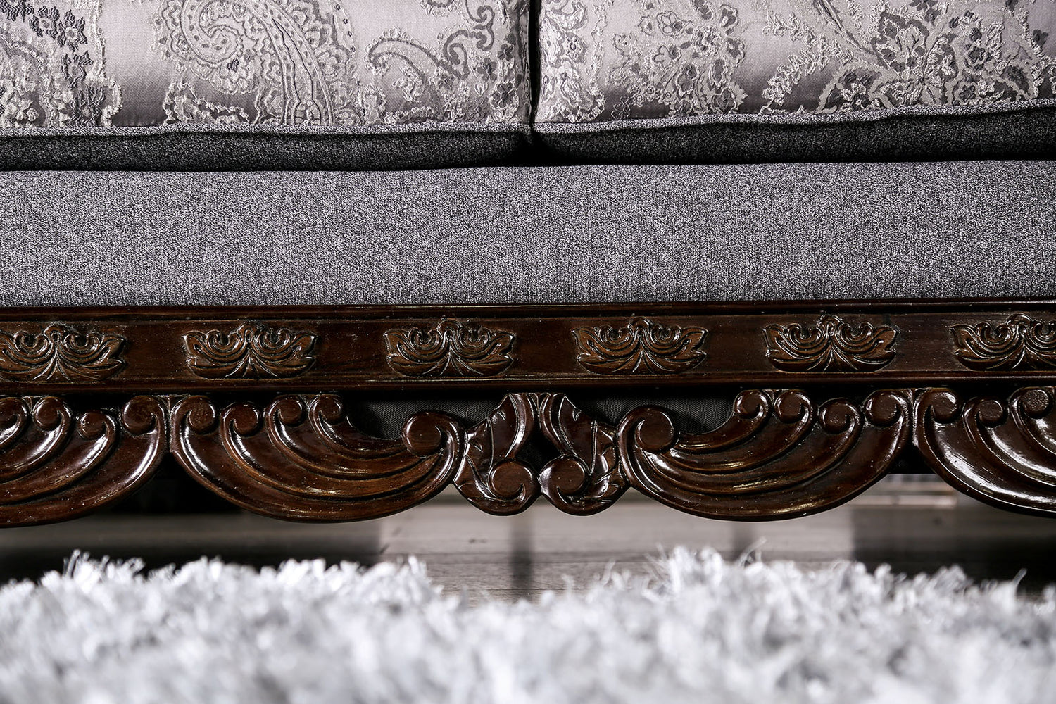 A stunning traditional design pairs with some modern flair to make for a beautiful sofa collection that can handle being the centerpiece of your living room. Wooden trim details, round bun feet and carved motifs make for an elevated elegance that adds to the luxury of your room. The seat features a distinct back with split deep tufts and beautifully-patterned fabric.