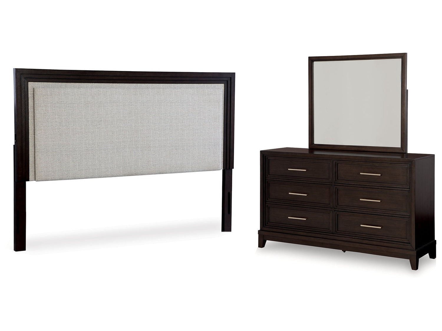 - Item Name: Neymorton Dark Grayish Brown Queen Upholstered Panel Headboard & Dresser & Mirror