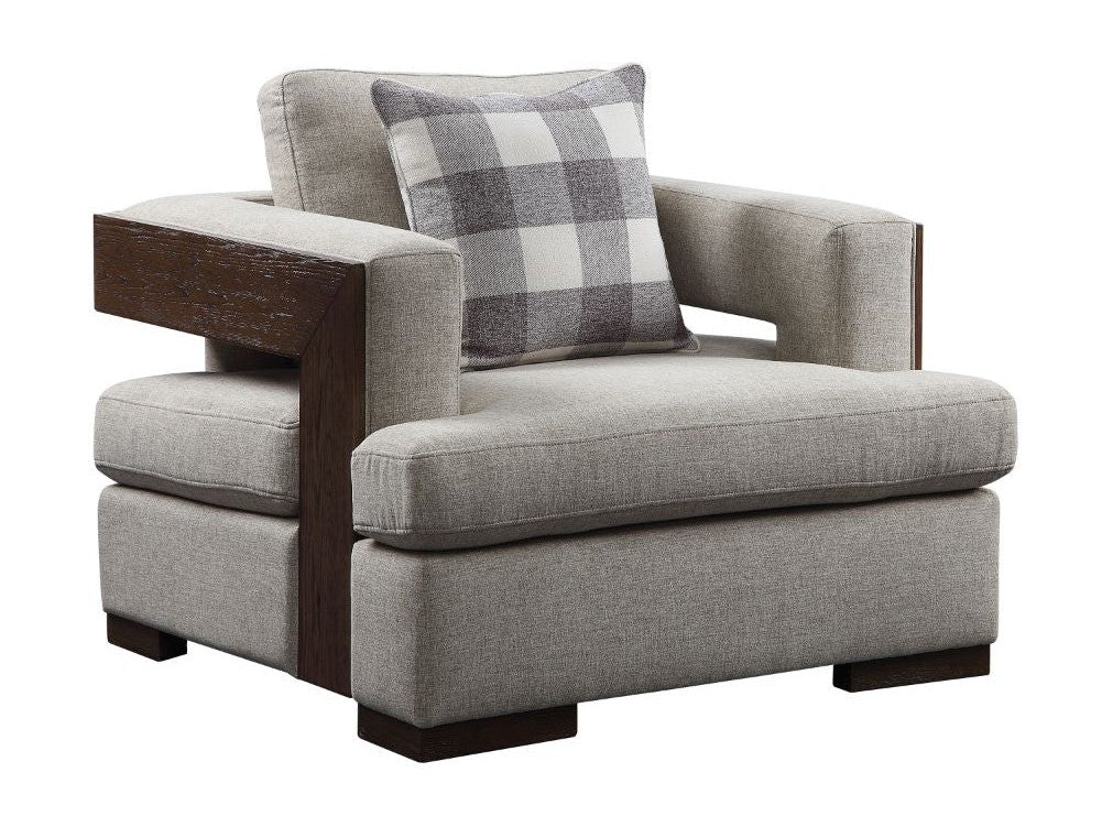 Assembled, w/1 Pillows Loose Back & Seat Cushion (1+1) CONSTRUCTION SEAT: Full Foam Cushion, Inside Frame: Wood w/Sinous Spring, "T" Shape Cushion (Reversible) BACKREST: Cushion, Outside w/Wood Trim ARMREST: Track with Outside w/Wood Trim Wooden Wide Block LEG: Walnut Finish, Leg Size: 2 Inches Height Material: Fabric (2-Tone Pattern) Pillows: Square Shape (Contrast Pattern, {Removable Cover)}
