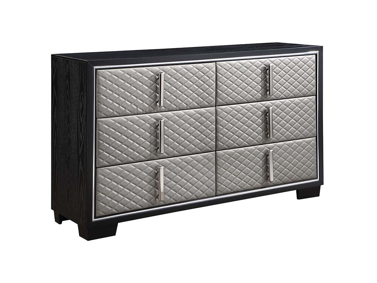 The glamorous Nicola dresser features show-stopping diamond quilted drawer fronts with gleaming chrome accents. The oversized chrome hardware makes a bold statement creating a modern bedroom piece. The sleek black finish is the perfect contrast to the silver PU. It features six ample storage drawers to store away clothing and display your makeup and perfume collection on the spacious tabletop.
