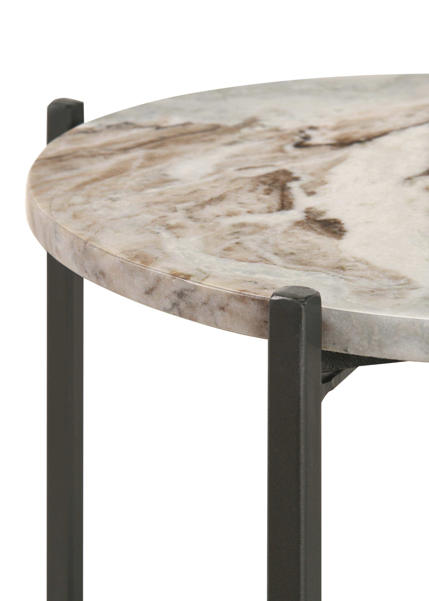 Mixed materials and sleek lines come together to create this transitional accent table. Featuring a round shape and straight, slim frame supports, this accent table supports books, refreshments and more with its tabletop and open bottom shelf. The disc-like tabletop is made of a white marble with elegant striations, cradled by an X-style metal frame in a dark gunmetal finish. The bottom shelf invites you to keep baskets off to the side, and offers a warm brown wood finish for a natural element. Place this versatile accent table in bedroom for a Nightstand: , or allow it to be used as a plant stand for your favorite flowers and greenery.