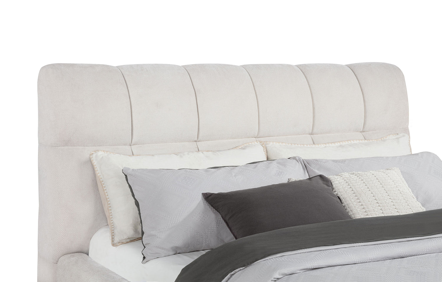 - Cream fabric upholstery brings warmth and tonal elegance to the soft modern frame,