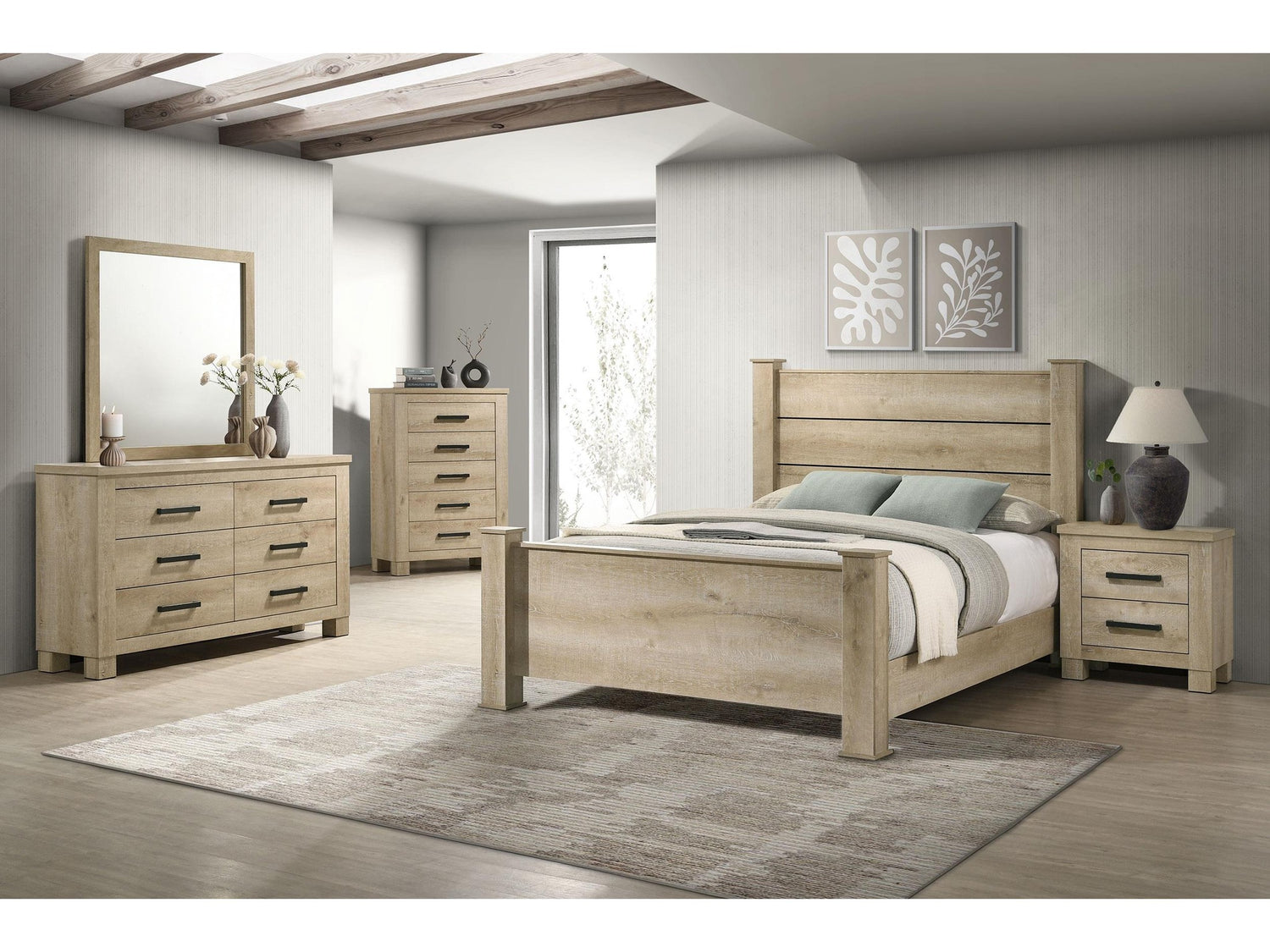 - Includes: One (1) eastern king bed, one (1) nightstand, one (1) dresser, one (1) dresser mirror, and one (1) chest of drawers