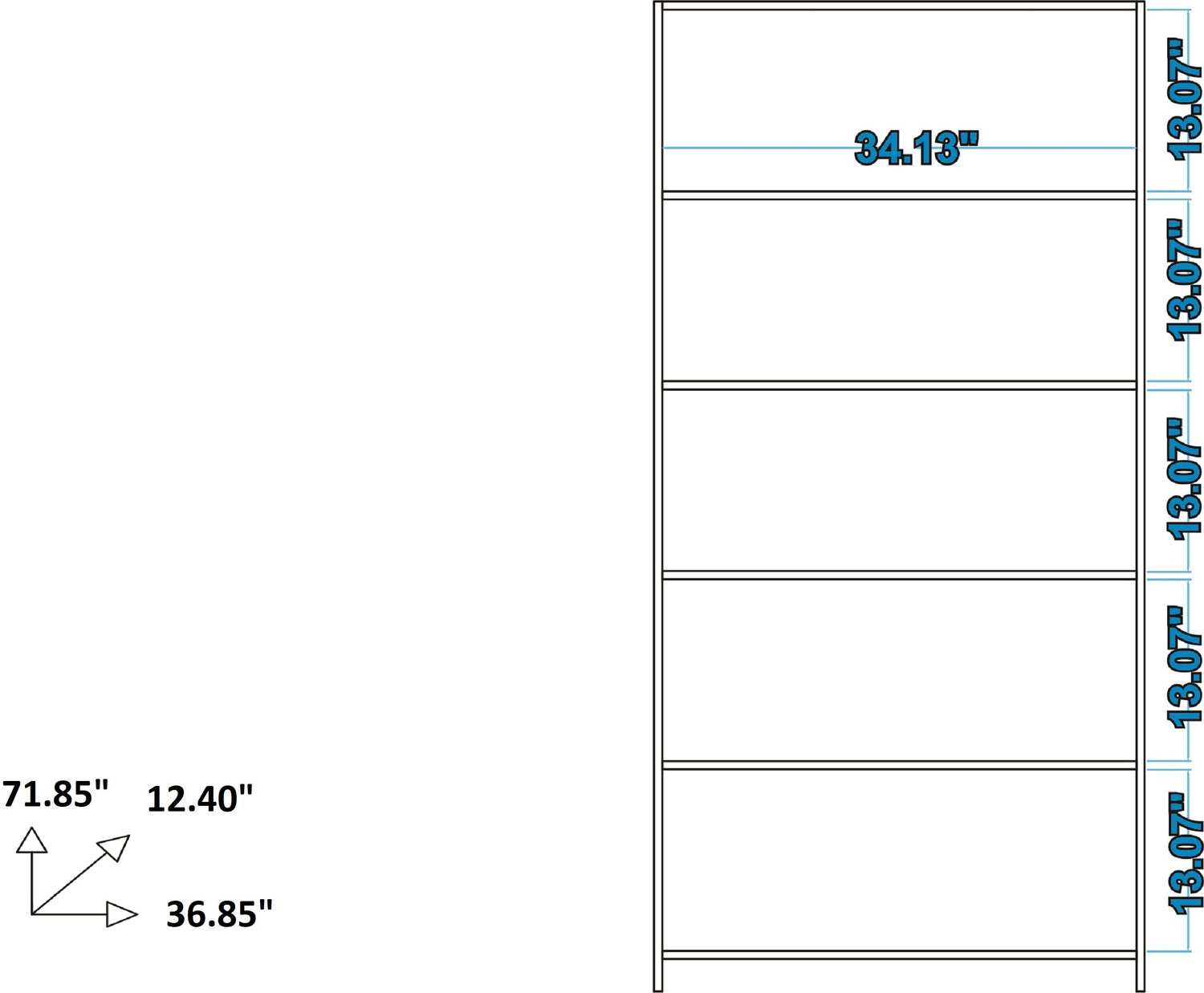 - Upon assembly, Bookcase Dimensions Measure: 35.63 in. Length, 71.85 in. Height, 12 in. Depth.