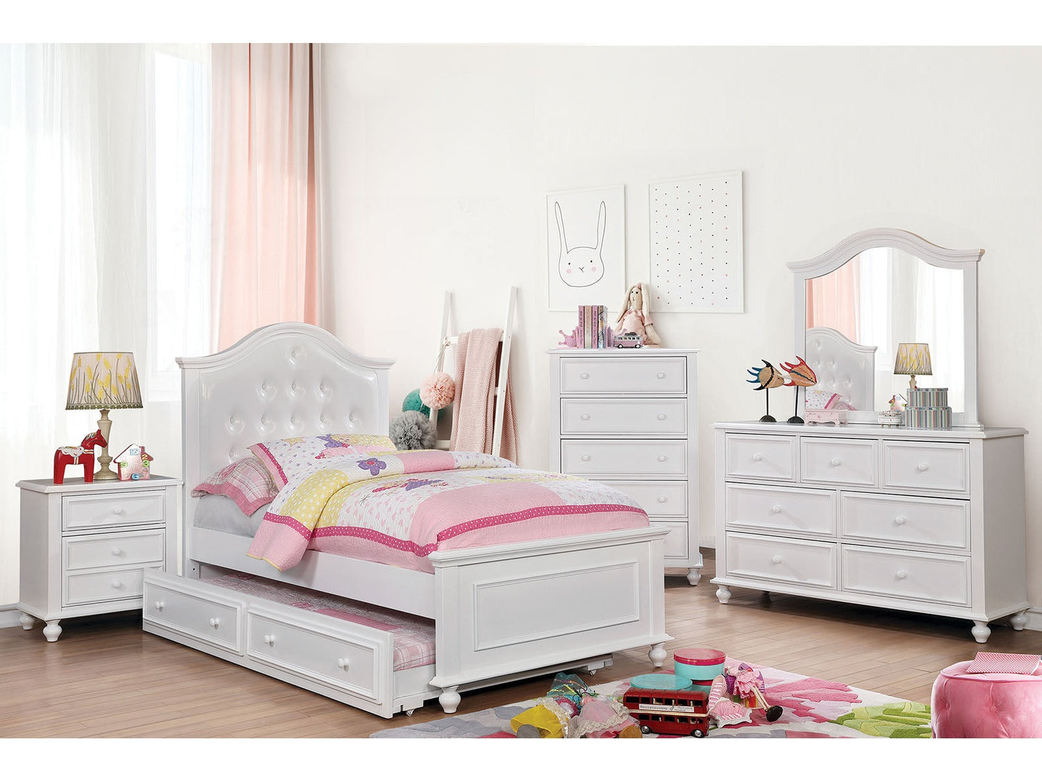 Fit for your little king or queen, this traditional style youth bed collection features intricate details and ample storage. The tufted leatherette headboard features a camelback design with moulded trim details to create a stylishly regal look that is sure to impress. With matching case goods that offer multiple roomy drawers and beautiful bun feet, there is no denying the practicality and beauty of this collection.