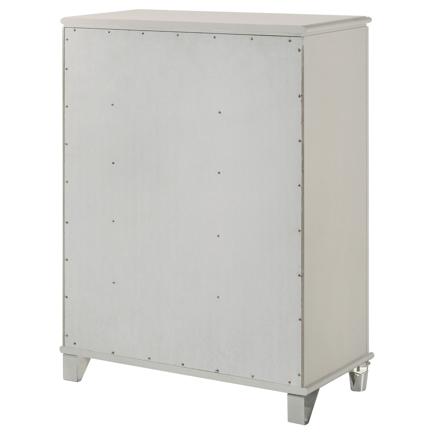 - Includes: One (1) chest- Elegant 5 drawer chest in pearl white finish