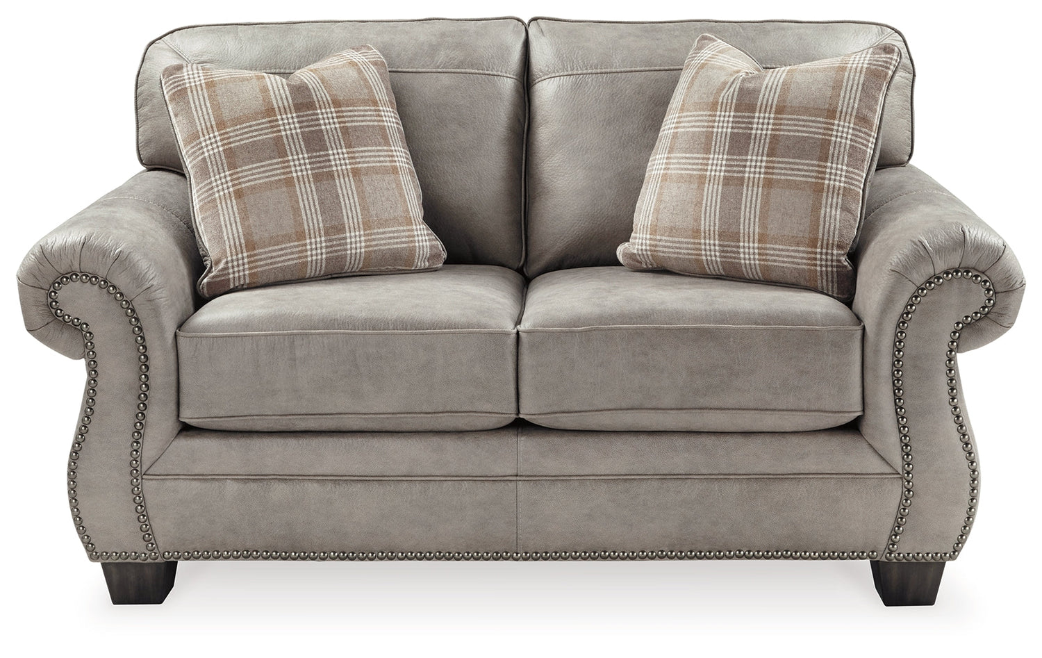 Seamlessly merging classic elements with modern trends, this loveseat invites you to bring home the best of then and now. Wrapped in a fabulous steel gray upholstery with a sumptuous suede-like feel, this easy-elegant loveseat is dressed to impress with updated roll arm styling and tailored touches including nailhead trim and window pane stitching. What you can’t see is every bit as impressive. Reversible seat cushions crafted with our highest-quality coils provide a bit of bounce and plenty of comfort and support.
