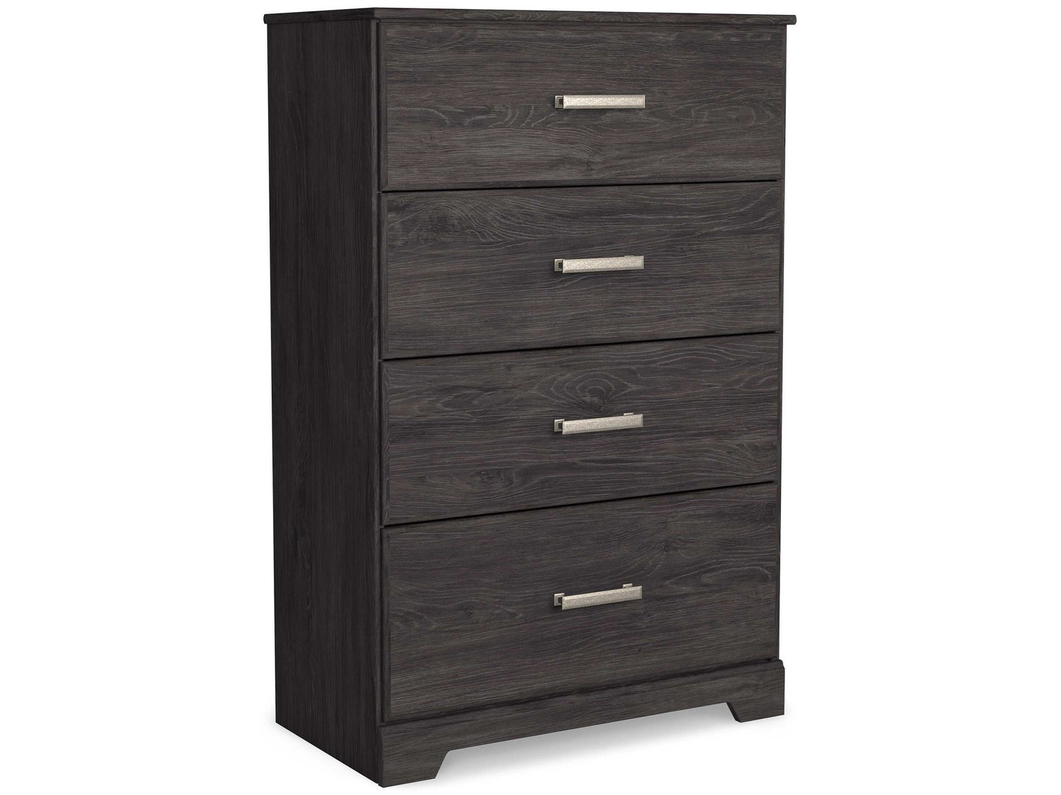 With its clean-lined look and modern attitude, this chest of drawers is a fresh style awakening. A warm charcoal hue over replicated oak grain easily complements other furniture finishes. Smooth drawer fronts with antiqued pewter-tone handles complete the aesthetic.