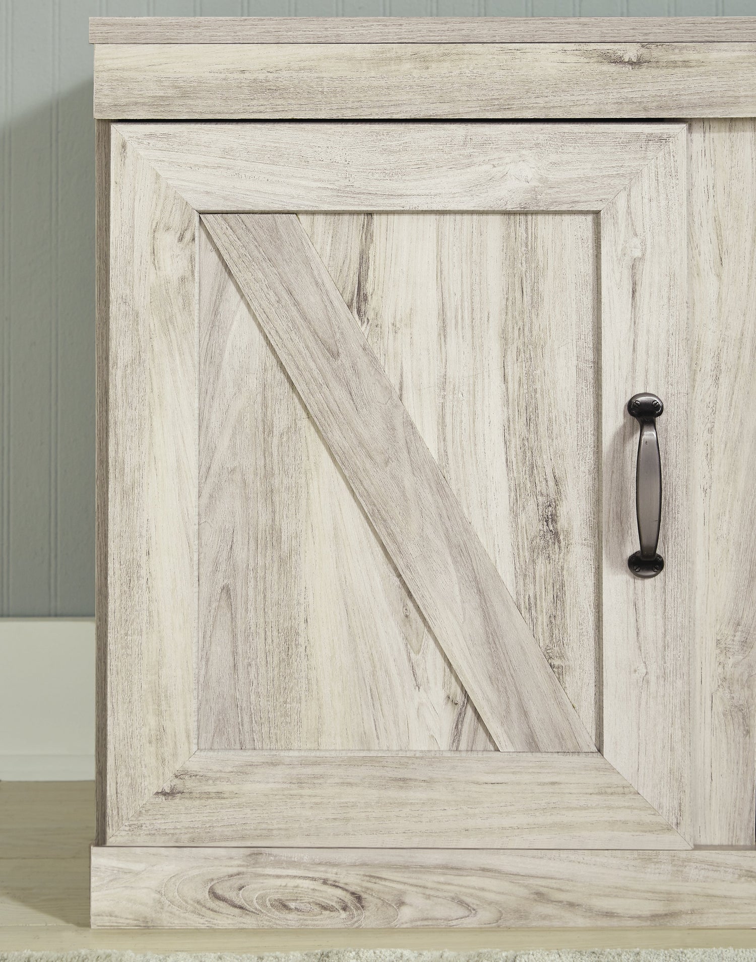 Express your farmhouse style with this entertainment center. A wispy white finish over replicated oak wood grain is a delightful change from the ordinary. Clean-lined, classic styling with barn door inspiration provides a country chic aesthetic that’s a breath of fresh air. A combination of cabinet storage and open display space makes for just the right mix.