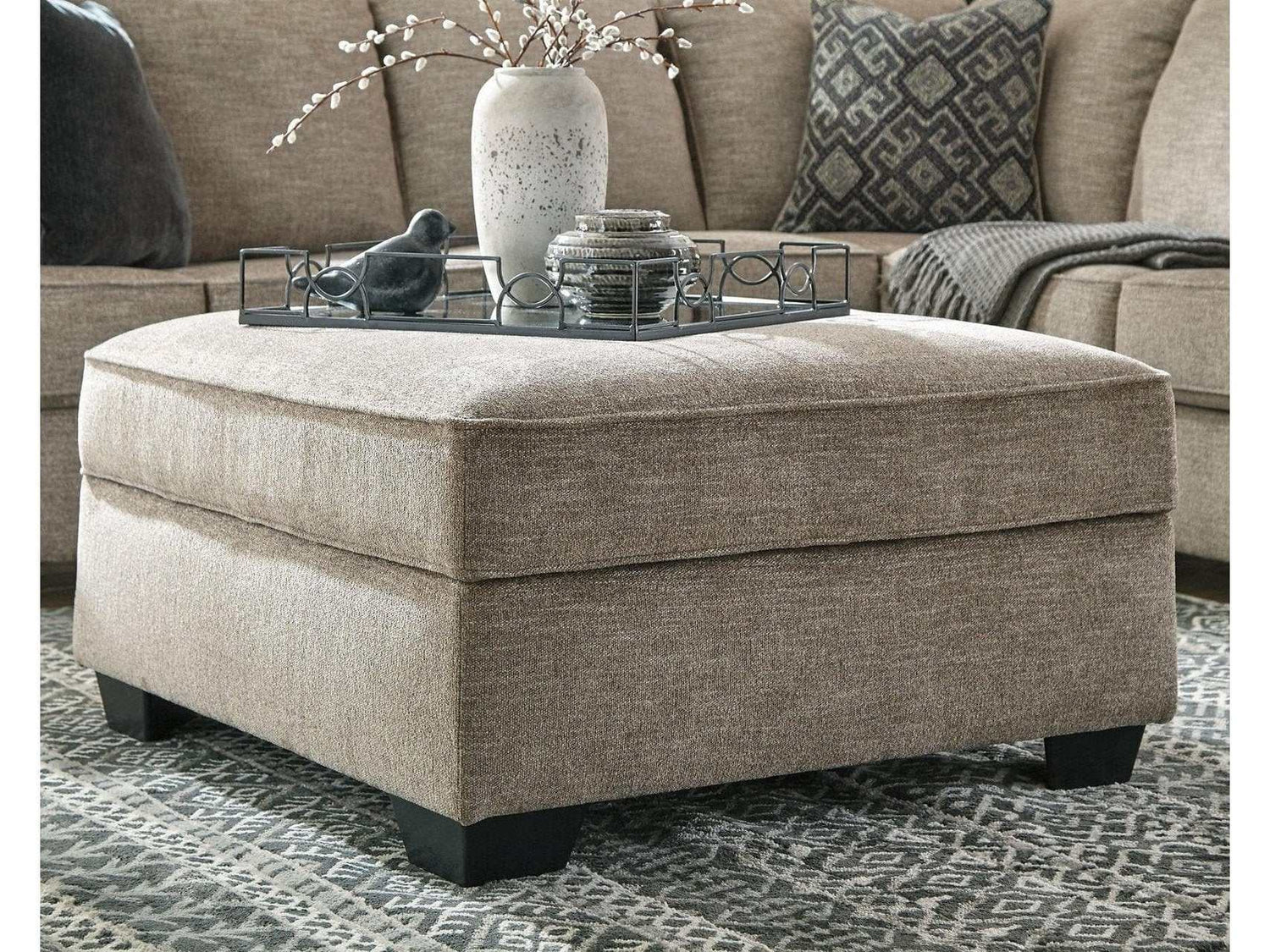 Whether your style is clean and contemporary or a cozy modern farmhouse, this generously sized ottoman in a stone-tone neutral upholstery has the corner on style. Merging ultimate comfort with striking good looks, this alluring ottoman makes itself useful with a hidden storage area for this, that, and the other.