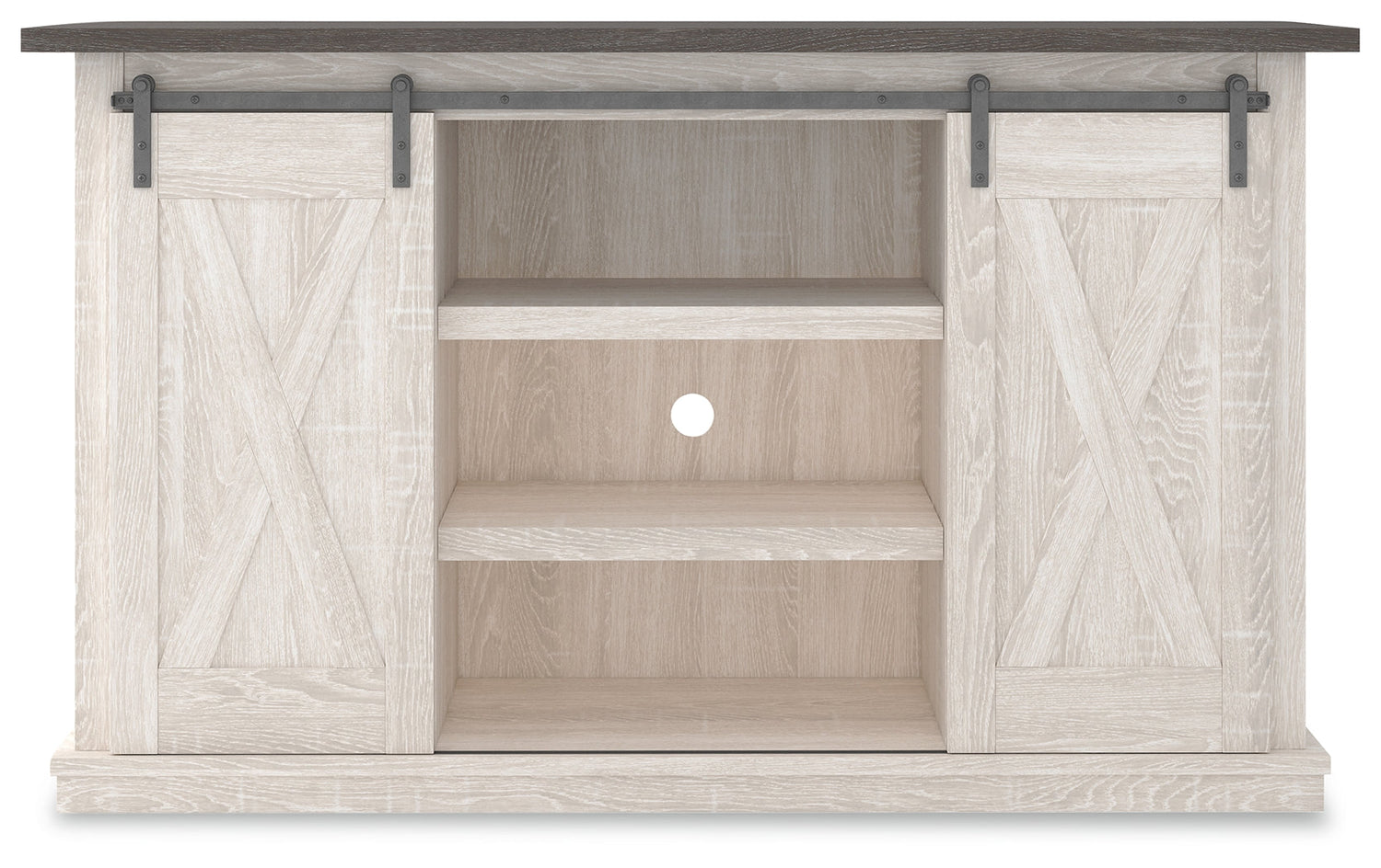 With its two-tone finish cross-buck details and authentic charm this TV stand is right in tune with your relaxed approach to high style. Beautifully made to accommodate your media equipment its well equipped with adjustable shelving cutouts for wire management and of course a pair of sliding barn doors you can center or place to the side. What a mastery in modern farmhouse living.