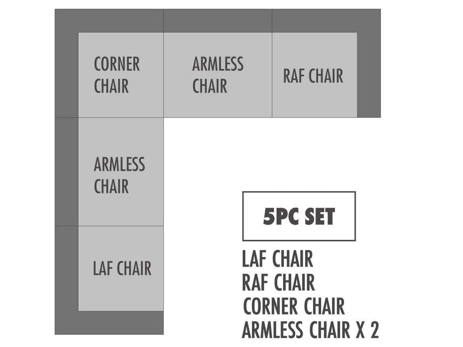 • Includes 5 pieces: left-arm facing corner chair, 2 armless chairs, wedge and right-arm facing corner chair
