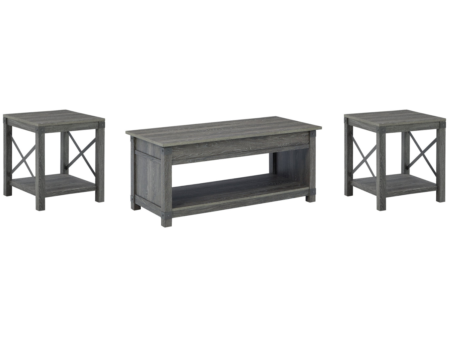 Raise the bar on modern farmhouse design with this accent table set. Sporting a grayish brown replicated wood grain effect, the coffee tables handy spring-loaded mechanism brings the tabletop closer to you. This versatile table makes it easier than ever to eat, work or play from the comfort of your sofa. A pair of coordinating end tables completes the set in style.
