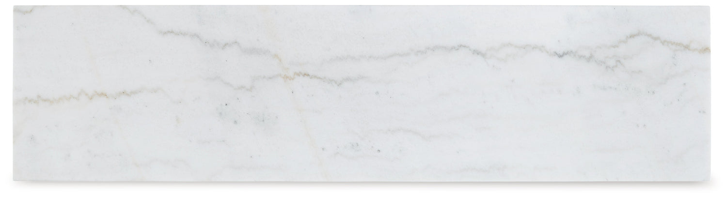 This sofa table is simple in design but big on style. Finished with a trend-right grayish brown wood tone, its bold, blocky profile and natural marble top are timeless classic choices that is ideal for pairing with an ottoman underneath to pull extra seating into the room or remaining clean and sleek on its own. Adding to its beauty, the marble tops color variations, fissures, mineral deposits and veining are naturally formed and are not defects.
