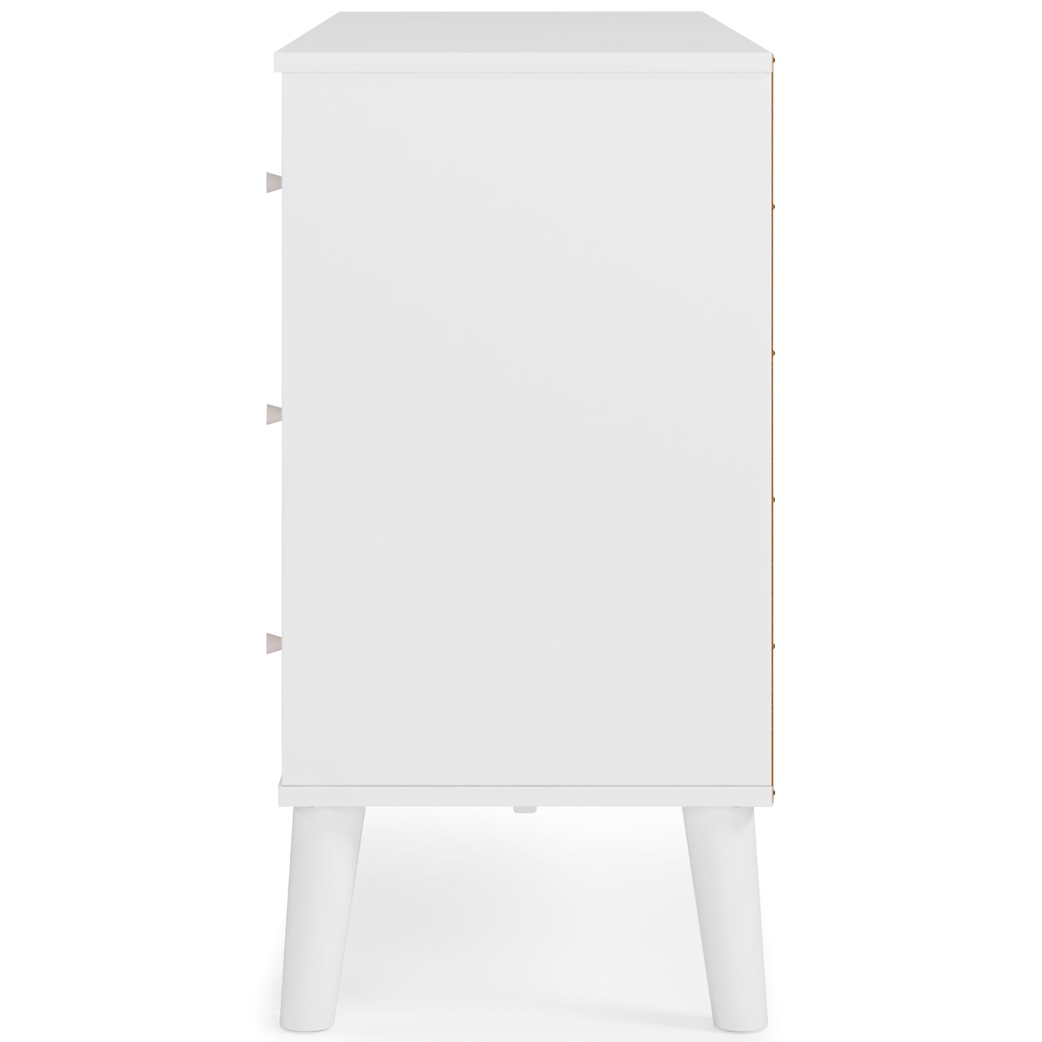 The perfect marriage of contemporary and casual style, this dresser is a charming addition to your home. Its expressive with a two-tone look in a solid matte white finish and a replicated sugarberry wood grain pattern. Ball-bearing glides offer smooth opening and closing of the drawers, while white knobs and splay legs add a finishing touch.