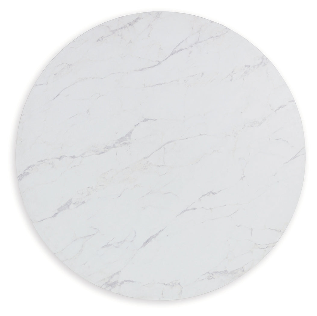 Clean lines meet cool curves with this dining table. Chunky round post legs and a natural finish lend a modern vibe, while a replicated white marble top completes the casual lifestyle design. What a delicious choice for a dining room update.