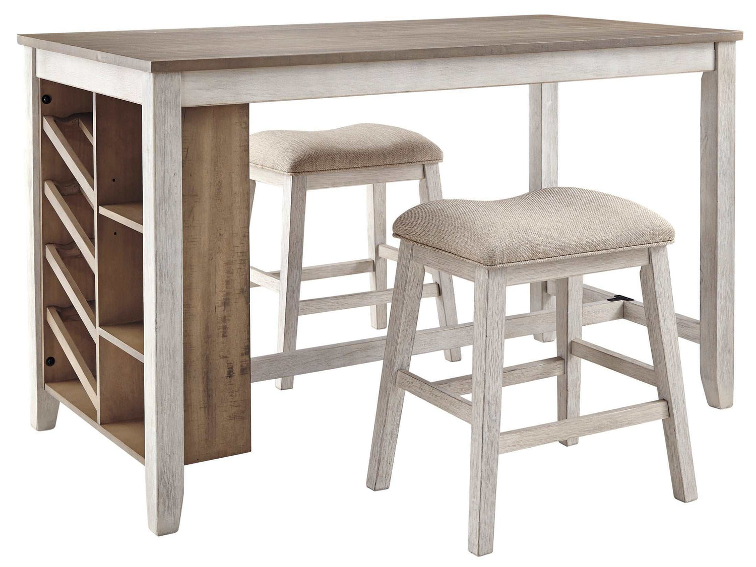 This counter-height table with storage invites you to raise the bar on small-space living. An inspired choice for coastal chic or modern farmhouse settings this clean-lined simply striking table doubles the charm with a brown tone top with a plank effect paired with a grayish-white base with a rub-through effect for timeworn appeal. Built-in 8-bottle wine rack and pair of open shelves make the most of every inch of space. These upholstered stools/chairs invite you to raise the bar on small-space living. An inspired choice for coastal chic or modern farmhouse settings this comfortably cushioned stool sports a grayish-white finish with a rub-through effect for timeworn appeal.