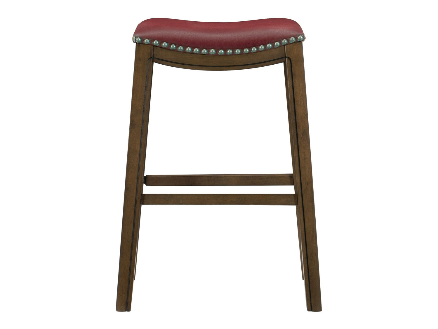 Transitional styling paired with versatility of selection makes the Ordway Collection a perfect addition to your home’s casual dining spaces. Whether pairing with a table that you already have, adding seating to your countertop or casual entertaining space, the three available heights provide several options to choose from. The stool is offered in three heights - 29-inches, 24-inches and 18-inches. The brown finished wood legs and seat apron feature routed accent while the red faux leather seat features nailhead trim that further defines the stool’s profile. 4 additional seat colors are available – brown, green, black and gray – in each stool height.