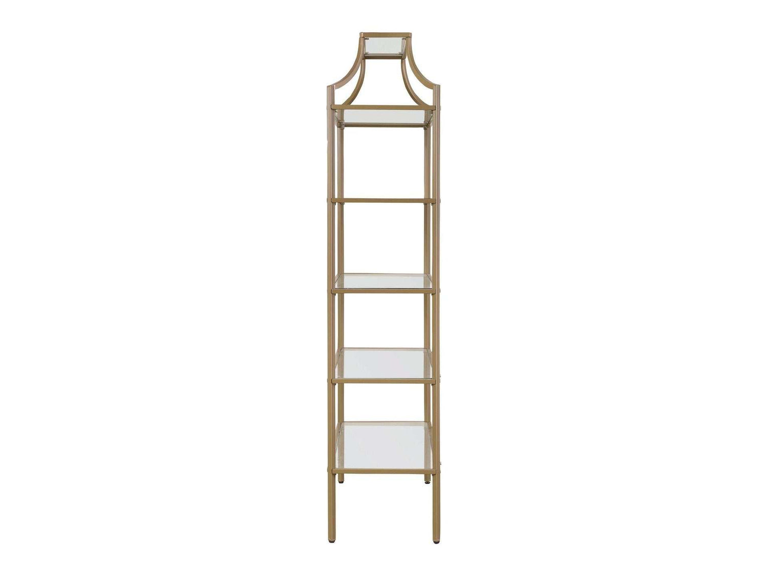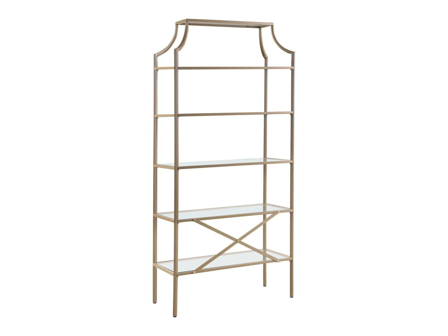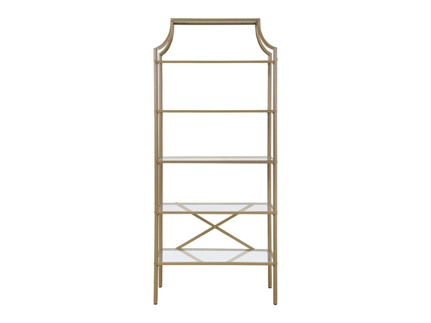A call for strength and style gets answered by this bookcase. Contemporary style allows for easy placement within your space. The stylish metal frame in gold creates conversation. Enjoy durability as all glass elements are tempered. Updated unit boasts five (5) open shelves for use as storage or display.