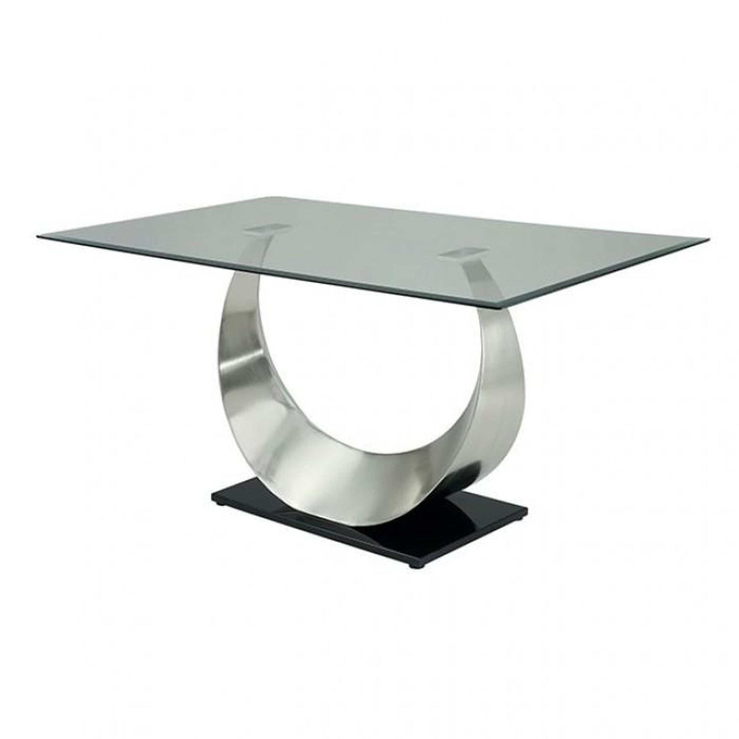 Graceful and dignified, this one-of-a-kind table will make any meal feel like a fanciful feast. Featuring a unique chrome base, this stunning fixture sits atop a contrasting black flat base as it holds up a beveled edge glass table top. Complete this piece with the coordinating round cut-out metal back chairs, which feature black foam filled seat cushions.