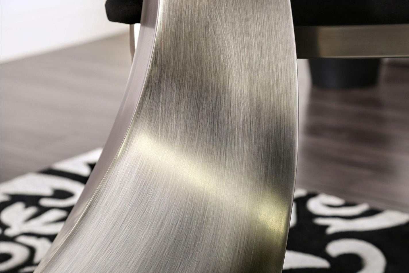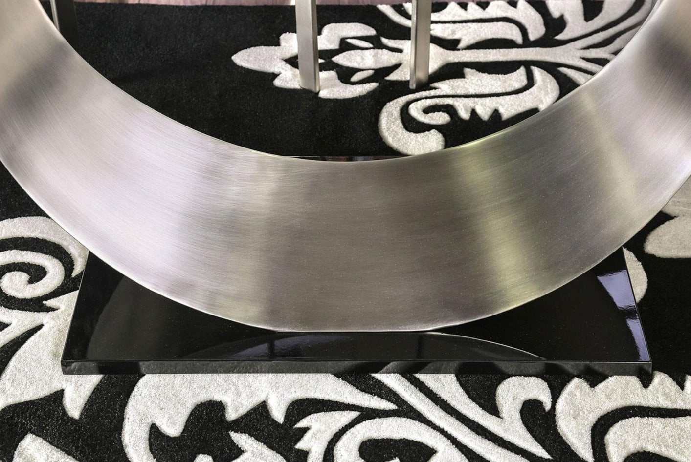 Graceful and dignified, this one-of-a-kind table will make any meal feel like a fanciful feast. Featuring a unique chrome base, this stunning fixture sits atop a contrasting black flat base as it holds up a beveled edge glass table top. Complete this piece with the coordinating round cut-out metal back chairs, which feature black foam filled seat cushions.