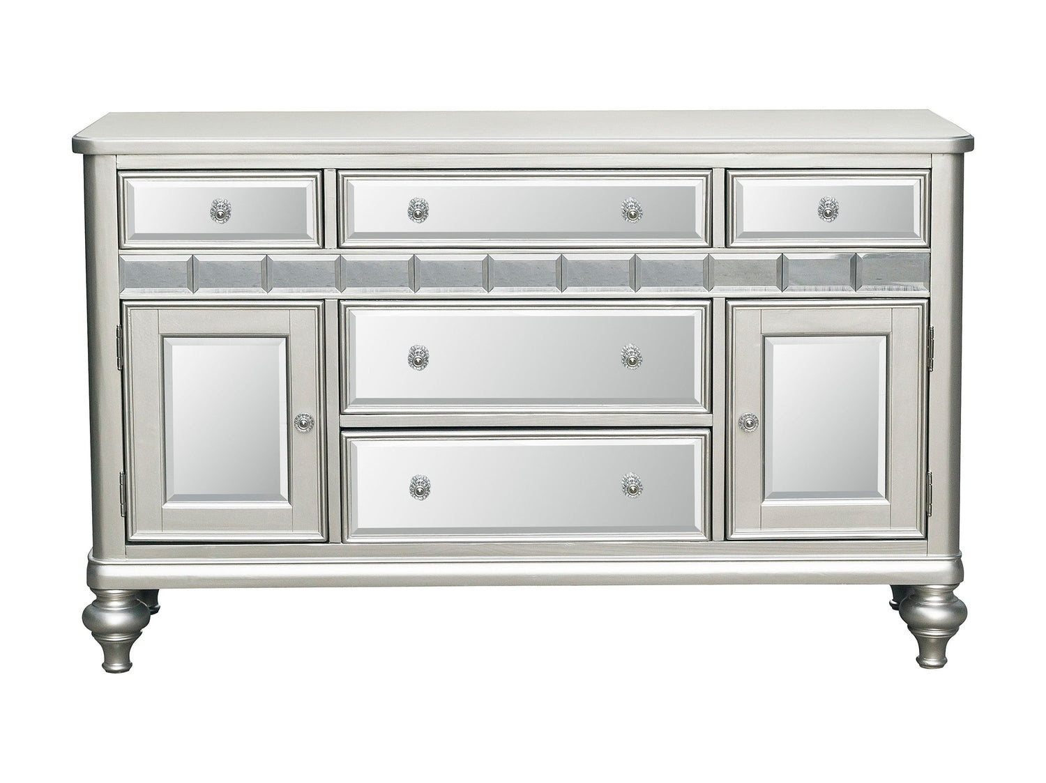 Casting a glamorous reflection of your personal style, the Orsina Collection will dazzle your friends and family as they enter the sophisticated dining space you have created. A sparkling silver finish enhances the fronts of the server, which provides ample drawer and behind door storage allows for the safe keeping of your tabletop accessories.