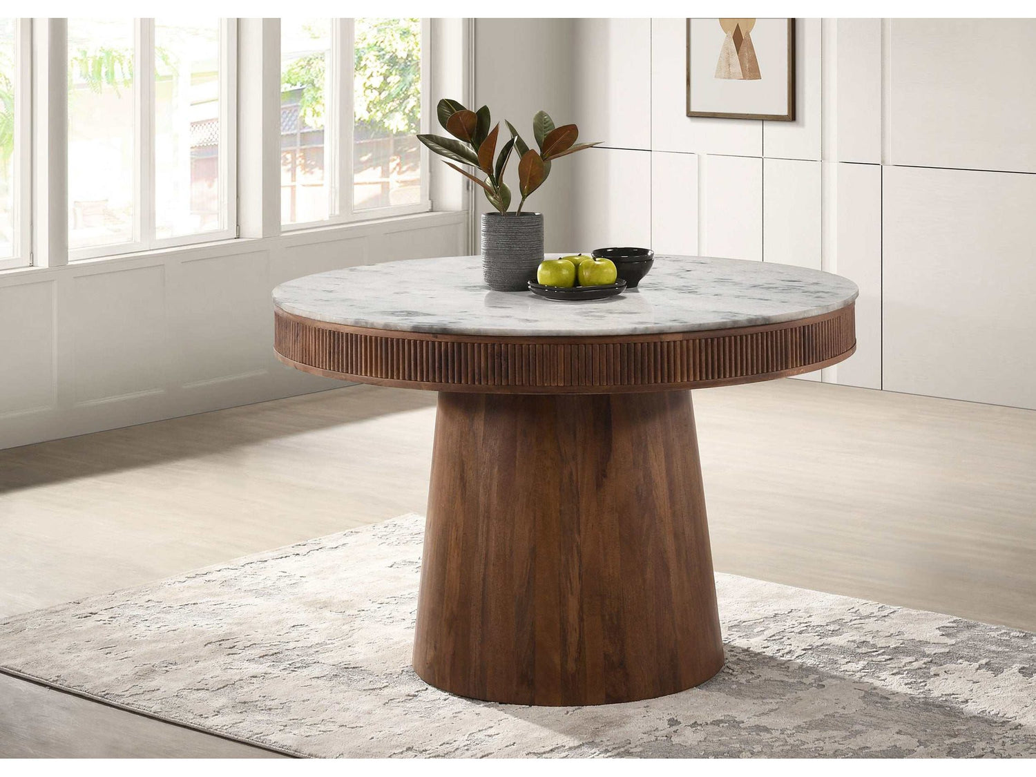 Introduce elegance into your dining space with our round white marble top dining table. The luxurious marble top adds a touch of sophistication, while the solid mango wood base with vertical fluting detail enhances the overall aesthetic. This exquisite table combines the beauty of natural materials with a modern design, creating a stunning centerpiece for memorable dining experiences.