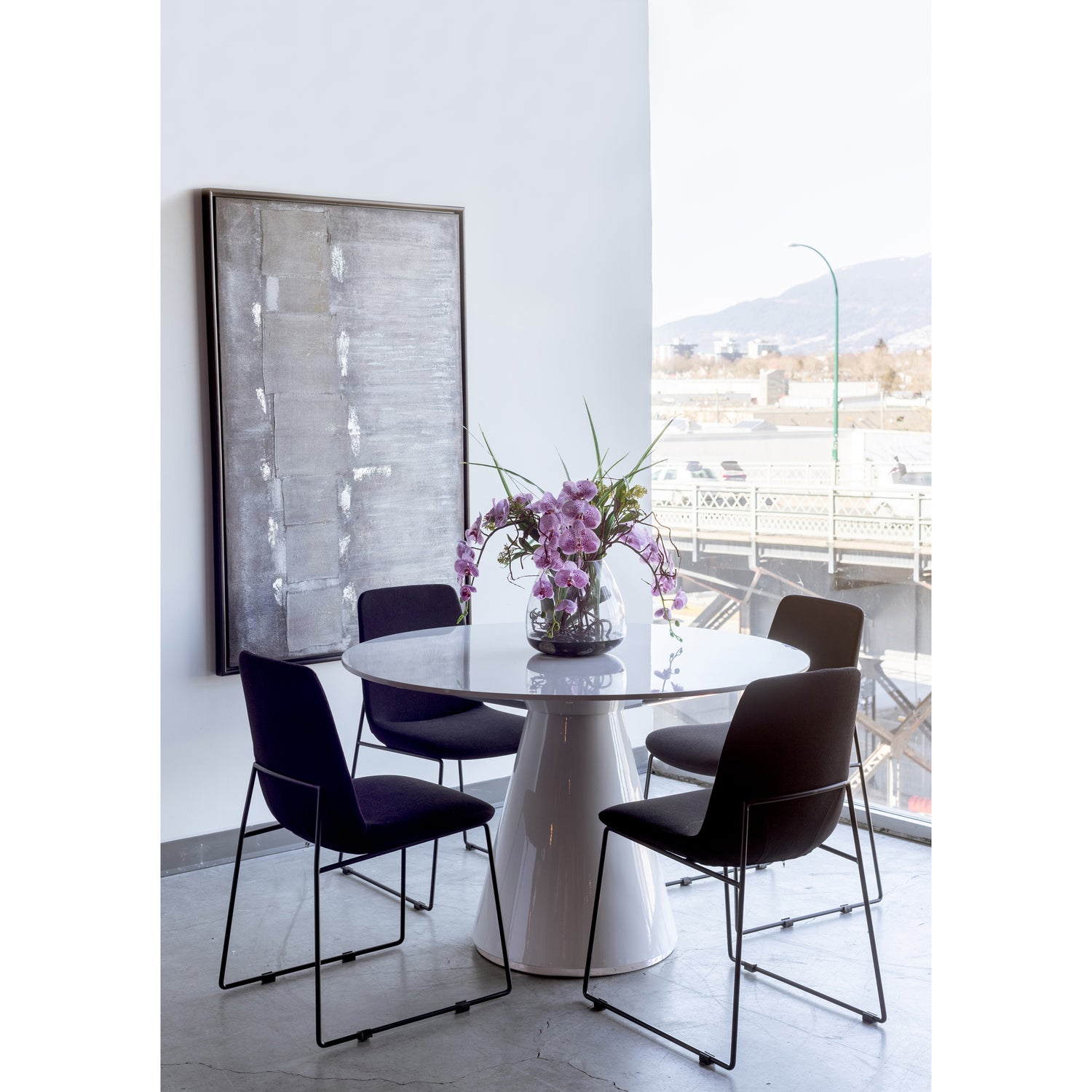 The Otago White 47In Round Dining Table is a dining table made with a high-gloss lacquer finish that offers a bright aesthetic. Its circular design brightens your dining area with a modern style.