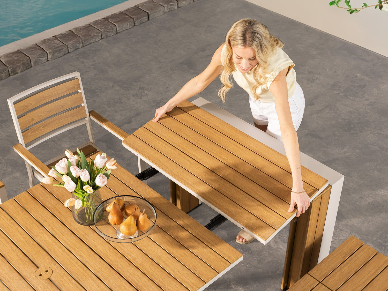 - Extendable outdoor dining table, seating up to 12 guests